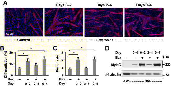 We have previously established that RXR signaling promotes the differentiation and fusion of skeletal myoblasts [39,40,41]. In this study, we used an interval approach to examine the window of rexinoid signaling in enhancing the myogenic program (Figure 1). As such, C2C12 myoblasts were differentiated for four days in the presence of bexarotene for different intervals: during the first two days of differentiation, the last two days or continuously throughout the four-day period. Intriguingly, only the addition of bexarotene during the first two days or throughout the four days of differentiation significantly enhanced the differentiation and fusion of myoblasts as determined by quantitative microscopy (Figure 1A–C). Two days after the initiation of myoblast differentiation, bexarotene treatment failed to significantly augment the differentiation or fusion of myoblasts compared to treatment during the first two days or throughout the 4 days of differentiation (Figure 1A–C). Additionally, the ability of bexarotene to enhance myogenic differentiation was also illustrated by a significant increase in muscle marker, MyHC compared with untreated myoblasts in the Western blot analysis (Figure 1D, Figure S1), suggesting that bexarotene treatment is most efficient during the early stage of differentiation as it may enhance myogenesis via an augmentation of early gene expression [41].