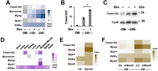 Since bexarotene promotes early myogenic gene expression, we utilized selective ligand-induced activation of myogenic programs to delineate novel myogenic targets and molecular interactions underlying skeletal myogenesis [41]. We have analyzed differential gene expression in C2C12 myoblasts differentiated for 12 or 24 h in the absence or presence of bexarotene with proliferating myoblasts as control. From the list of genes with unknown functions in myogenesis, we focused upon Tmem182, a novel transmembrane protein that is upregulated nearly 5-fold during the first 24 h of differentiation (Figure 2A), similar to other muscle-specific membrane protein such as myomixer [47,48,49]. RT-qPCR and Western blotting analysis validated that the levels of Tmem182 mRNA and protein were significantly augmented further following the addition of bexarotene (Figure 2B,C, Figure S1). Notably, bexarotene enhanced Tmem182 expression by approximately 1.85-fold at 12 h and 2.5-fold at 24 h compared to untreated cells at the same time points. Due to the lack of functional information regarding Tmem182, we also assessed its tissue-specificity across nine mouse tissues [50], which displayed the highest Tmem182 expression in muscle tissue including skeletal and cardiac muscle (Figure 2D). Thus, Tmem182 is presented as a rexinoid-responsive target with an expression profile similar to other important myogenic regulators such as myogenin.