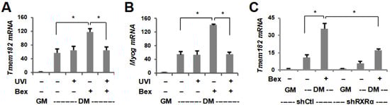 Given that Tmem182 is a bexarotene-responsive gene target, we also assessed the requirement of RXR for Tmem182 expression (Figure 3A,B). To this end, we utilized a known and potent RXR antagonist, UVI3003 [54], in that C2C12 myoblasts were differentiated with bexarotene in the absence or presence of UVI3003. Intriguingly, the RXR antagonist did not considerably affect Tmem182 gene expression in untreated controls but significantly attenuated the enhancement effect of bexarotene on Tmem182 and myogenin expression (Figure 3A,B). Furthermore, since bexarotene enhances myoblast differentiation via the activation of RXRα specifically, we utilized our established RXRα shRNA knock down stable myoblasts for the Tmem182 study [39]. As shown in Figure 4C, the induction of Tmem182 by bexarotene was significantly attenuated in shRXRα stable myoblasts compared with the shRNA control myoblasts (Figure 3C). Interestingly, the loss of RXRα in the absence of bexarotene treatment also decreased Tmem182 expression compared to control myoblasts, suggesting a possible role for unliganded RXR in the expression of Tmem182, as it may disrupt RXR-mediated chromatin modifications at regulatory loci. Taken together, Tmem182 is a target of RXR signaling in the enhancement of myogenic differentiation via RXRα as a transcription factor (Figure 3).