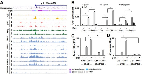 Regulation of Tmem182 expression. (A) C2C12 myoblasts were differentiated in the absence or presence of bexarotene (Ctl or Bex) for 24 h. Genome browser view for enrichment of p300 and various histone modifications [GSE94558, GSE139942] is shown at the Tmem182 locus. RNA Polymerase II (Pol II) enrichment was obtained from proliferating C2C12 myoblasts (GM) and myoblasts differentiated for 4 days (d4) [GSE25308]. Blue bars show Refseq gene position, and the panel below presents mammalian conservation of the locus as quantified by the UCSC genome browser. (B) C2C12 cells were differentiated for 24 h (DM) in the presence or absence of bexarotene with proliferating myoblasts as controls. ChIP-qPCR analysis was performed at the Tmem182 promoter using antibodies against p300, MyoD, and myogenin. Normal IgG antiserum and a random locus (Ctl) were used as negative controls. Quantification is presented as the percentage of enrichment in relation to input chromatin DNA (error bars: SEM; n = 3; *, p < 0.05). (C,D) Tmem182 and myogenin mRNA levels were examined by RT-qPCR and presented as the fold change in relation to proliferating myoblasts following p300 knockdown (shEP300), with a non-silencing shRNA (shCtl) used as a control.