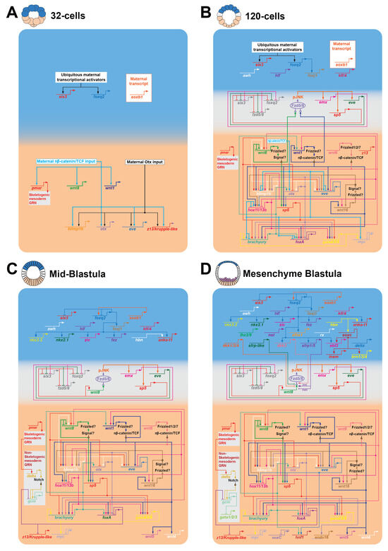 The progressive deployment of the endomesoderm, equatorial ectoderm, and anterior neuroectoderm gene regulatory networks from cleavage to early gastrula stages. (A) At the 32-cell stage, ubiquitous maternal factors activate the ANE GRN in the anterior half of the embryo, while localized maternal intracellular cWnt components nuclearize β-catenin, activating the EM GRN in the posterior half of the embryo. (B) As early as the 60-cell stage, mid-level regulatory genes are activated in the ANE and EM GRNs, and Wnt1/Wnt8-Fzd5/8-JNK signaling downregulates the ANE GRN from the equatorial ectoderm. (C) By the mid-blastula stage, the endoderm and mesoderm territories begin to segregate, and mid-level regulatory genes are activated in the ANE GRN. (D) At the mesenchyme blastula stage, signaling feedback loops between the ANE GRN and the equatorial ectoderm help define the final position of the ANE territory, while the endoderm and mesoderm GRNs are further refined to prepare for gastrulation. Data taken from [2,50,53,64,65,68,76,94,101,112,113,114,115,116,117,118,119,120,121,122,123,124,125,126,127,128]. Lateral embryo images in the figure created in BioRender (https://BioRender.com/7bogzo4, accessed on 6 July 2025).