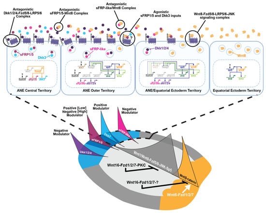 In addition to these traditional Wnt receptors, a recent spatiotemporal expression study showed that transcripts of two Wnt co-receptors, ROR1/2 and RYK, are also co-expressed in many of the same territories as the Wnt and Fzd genes throughout early anterior–posterior patterning. In multiple model systems, ROR1/2 and RYK have both been implemented as co-receptors for canonical and/or non-canonical Wnt/JNK or Wnt/Ca2+ signaling pathways depending on cellular context [82,83,84,85,86,87,88,89,90]. Both ror1/2 and ryk transcripts in the sea urchin are broadly expressed throughout the embryo, overlapping with wnts1, 6, 7, 8, and 16, as well as fzd1/2/7 and fzd5/8 expression during cleavage stages (Figure 2A). Then zygotic ror1/2 and ryk expression is dynamic, like Wnt and Fzd gene expression. By the mesenchyme blastula stage, ror1/2 expression has been downregulated from the ANE territory and expressed primarily in the posterior endomesoderm and ventral ectoderm territories, whereas ryk is expressed in the ANE, ventral equatorial ectoderm, and endomesoderm territories [81]. Thus, there is a complex expression landscape of seven Wnt ligands overlapping with three Fzd receptors as well as ROR1/2 and RYK in the recently segregated endoderm and mesoderm at the beginning of gastrulation. Also, in the ectoderm, wnt5, wnt7, and wnt8 are co-expressed with fzd1/2/7 in the equatorial ectodermal region (Figure 2A). Together, these expression data suggest that ROR1/2 and RYK could play important roles in modulating which Wnt signaling pathways might be active in a particular territory.
