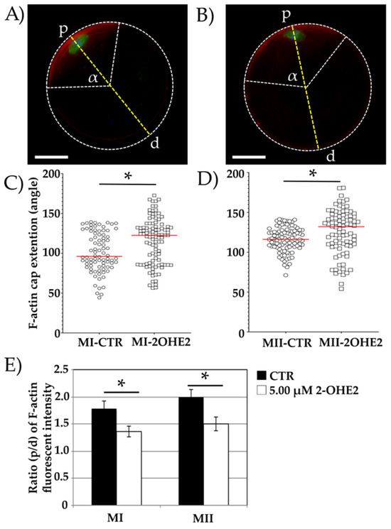 Furthermore, fluorescence intensity analysis revealed a significantly higher (p < 0.05) F-actin cap signal in both MI and MII CTR oocytes compared to those matured in the presence of 2-OHE2 (Figure 3E).