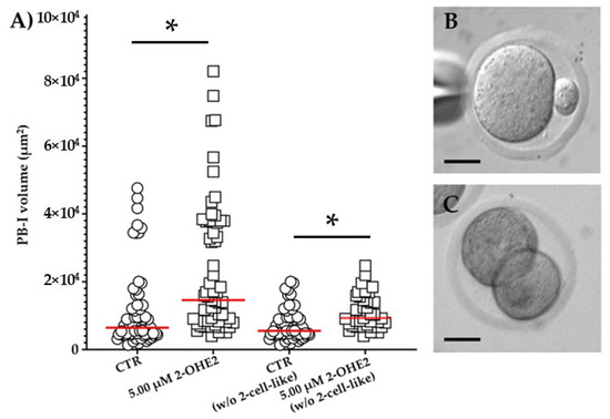 (A) Distribution of PB-I volume for control (CTR) and 2-OHE2-exposed oocytes. The analysis includes (CTR or 5.00 μM 2-OHE2) or excludes (CTR or 5.00 μM 2-OHE2 excluding 2-cell-like embryos) oocytes from the count. Red bar represents the median value. * p ≤ 0.001. Examples of MII oocyte with a PB-I derived after an asymmetric (B) or symmetric, 2-cell-like configuration, division (C); bar: 30 µm.