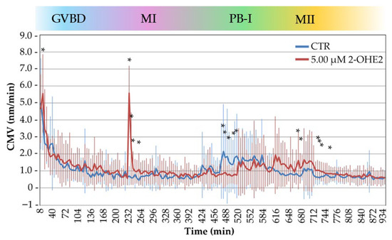 Cytoplasmic movements velocity (CMV) profiles of control (CTR) and 2-OHE2-exposed oocytes recorded over a 15 h period during the GV-to-MII transition. The color bar indicates the progression of oocyte maturation phases: GVBD (germinal vesicle breakdown), MI (metaphase I), PB-I (polar body I), and MII (metaphase II). * p < 0.05.