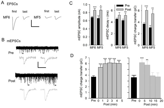 To examine the time course of the increase in mEPSC size, the MF6 mEPSC charge transfer was plotted every minute post-stimulation for 5 min (Figure 1D). The mEPSC charge transfer increased during the first minute post-stimulation, and this increase persisted for 5 min. In a few cases, the mEPSCs were followed for 20 min post-stimulation, showing that the increase persisted for approximately 10 min before returning to its initial value (Figure 1D).