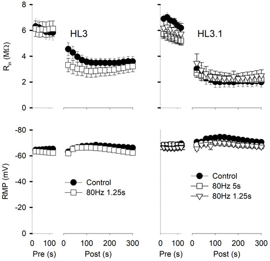 Muscle fiber input resistance (Rin) and resting membrane potential (RMP) during two successive electrode penetrations. Rin and RMP were measured every 20 s during the initial penetration (Pre) and the repenetration (Post). For each treatment, the last pre value was compared to all post values using one-way repeated measures with a post hoc Holm–Sidak test. Left: Experiments were performed in HL3 with 80 Hz,1.25 s stimulation or no stimulation (Control). For Rin, all post values were significantly less (p < 0.001) than pre for both control (n = 20 MFs, 16 larvae) and 80 Hz, 1.25 s stimulation (n = 12 MFs, 7 larvae). For RMP, post 80 s to 200 s values were significantly different from pre values for controls, and post 40 s to 200 s values were significantly different (p < 0.05) from pre values for 80 Hz, 1.25 s. Right: Experiments were performed in HL3.1. All post values for Rin were significantly less (p < 0.001) than pre values for all treatments. For RMP, none of the post values were significantly different from Pre for 80 Hz, 1.25 s (n = 11 MFs, 6 larvae) and 80 Hz, 5 s (n = 28 MFs, 17 larvae), but post 40 s to 160 s values were significantly different from pre values (p < 0.05) for controls (n = 13 MFs, 11 larvae).