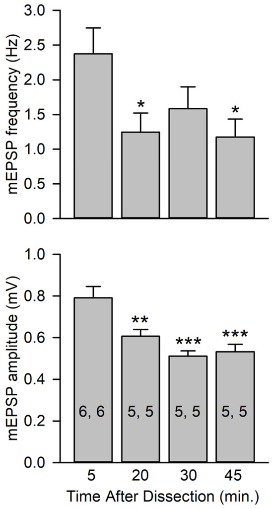 mEPSP amplitudes at various times after dissection. mEPSPs were recorded from preparations rested for various intervals after dissection; intervals were measured from the time that nerves were cut to the beginning of mEPSP recordings. The time intervals were 5, 20, 30, and 45 min (±10 s for all experiments). All experiments were performed in HL3 saline. Top: mEPSP frequencies at 20 and 45 min were significantly less than those measured at 5 min. Bottom: mEPSP amplitudes measured at 20, 30, and 45 min were significantly less than those measured at 5 min. n values are posted on bars (MFs, larvae) and data were analyzed using a one-way ANOVA with a post hoc Holm–Sidak test; * p < 0.05, ** p < 0.01, *** p < 0.001.