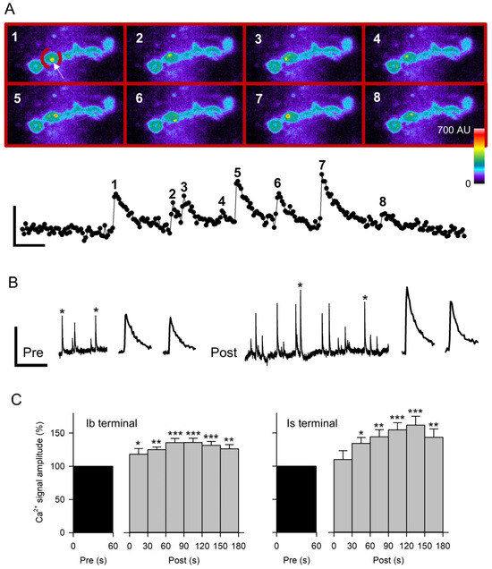 We measured the spontaneous Ca2+ signals in regions of interest (ROIs), which contained the postsynaptic GCaMP fluorescence associated with a single synaptic bouton (Figure 5A). The peak increase in the arbitrary units (AU), averaged for all pixels within the ROI, was compared pre- and post-stimulation for the same ROIs (Figure 5B). Prior to stimulation, the Ca2+ signal frequency per terminal length was significantly greater for Ib terminals (1.86 ± 0.36 Hz/100 µm) compared to Is terminals (0.75 ± 0.09 Hz/100 µm; p < 0.01, t-test); this is consistent with previous findings and appears to be due to fewer active zones along the Is terminals [30].