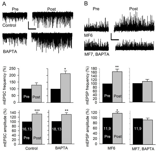 To determine whether an increase in postsynaptic Ca2+ concentration was required for the potentiation of quantal size, we injected the Ca2+ buffer BAPTA into the MF prior to performing stimulation experiments. In these experiments, we used MF7 since its small size made it easier to fill with BAPTA, and we examined mEPSC and mEPSP amplitude and frequency. First, we stimulated at 20 Hz for 1 min and recorded mEPSCs for 3 min pre-stimulation and 5 min post-stimulation in HL3. In control experiments, stimulation produced an increase in mEPSC amplitude but no change in mEPSC frequency (Figure 6A). When MF7 was preinjected with BAPTA for 5 min, there was an increase in both mEPSC amplitude and frequency. The effect of BAPTA injection on mEPSC frequency is consistent with a previous study where prolonged Ca2+ influx was found to depress mEPSC frequency [18]. It appeared that BAPTA injection lowered postsynaptic Ca2+ enough to reduce the depression of mEPSP frequency but not enough to prevent the increase in mEPSP amplitude. To allow for more effective buffering of Ca2+, we repeated the experiments using a briefer stimulation protocol. The nerve was stimulated at 80 Hz for 1.25 s in HL3, and mEPSPs were recorded from MF6 and MF7 pairs; MF6 and MF7 are adjacent and innervated by the same motor axons. In controls, there was an increase in mEPSP amplitude and frequency for both MFs. The mEPSP amplitude increased by 16.6 ± 7.2% in MF6 (p < 0.05, paired t-test) and 17.6 ± 4.5% (p < 0.01, paired t-test; n = 10 MFs, 8 larvae) in MF7. The mEPSP frequency increased by 34.0 ± 7.6% in MF6 (p < 0.01, paired t-test) and 46.8 ± 7.1% (p < 0.001, paired t-test) in MF7. We repeated this experiment after injecting MF7 with BAPTA. We found that BAPTA injection prevented the increase in mEPSP amplitude and frequency in MF7; however, the previous increase in mEPSP amplitude and frequency was still seen in uninjected MF6 (Figure 6B). Thus, BAPTA injection blocked both the increase in mEPSP amplitude and frequency produced by brief stimulation.