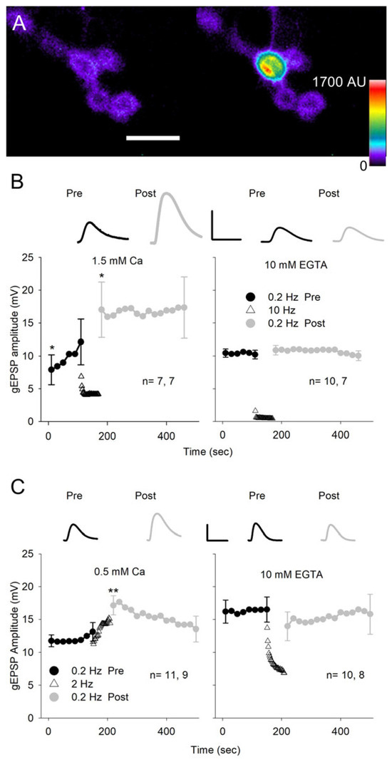 4.3. The Potentiation of mEPSP Amplitude Is Dependent upon an Increase in Postsynaptic Ca2+