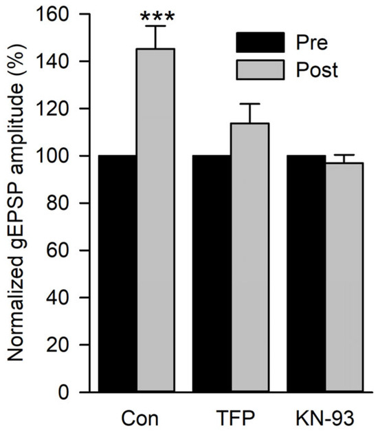 The effect of calmodulin and CamKII inhibitors on the potentiation of gEPSP amplitude. The potentiation of gEPSPs produced by glutamate conditioning pulses delivered at 2 Hz was compared for control (Con), TFP, and KN-93 experiments. All post-conditioning values were normalized to their pre-values. Control experiments (n = 11 MFs, 9 larvae) showed a significant increase in gEPSP amplitude, but TFP (n = 12 MFs, 6 larvae) and KN-93 (n = 19 MFs, 6 larvae) experiments did not. Pre-gEPSP amplitudes were compared to post-gEPSP amplitudes using a paired t-test before normalization. *** p < 0.001.