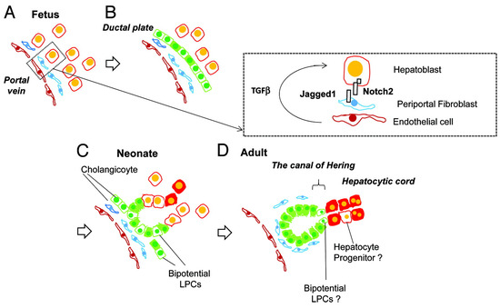 - Carpentier, R.; Suer, R.E.; Van Hul, N.; Kopp, J.L.; Beaudry, J.; Cordi, S.; Antoniou, A.; Raynaud, P.; Lepreux, S.; Jacquemin, P.; et al. Embryonic Ductal Plate Cells Give Rise to Cholangiocytes, Periportal Hepatocytes and Adult Liver Progenitor Cells. Gastroenterology 2011, 141, 1432. [Google Scholar] [CrossRef]