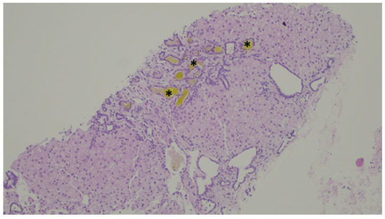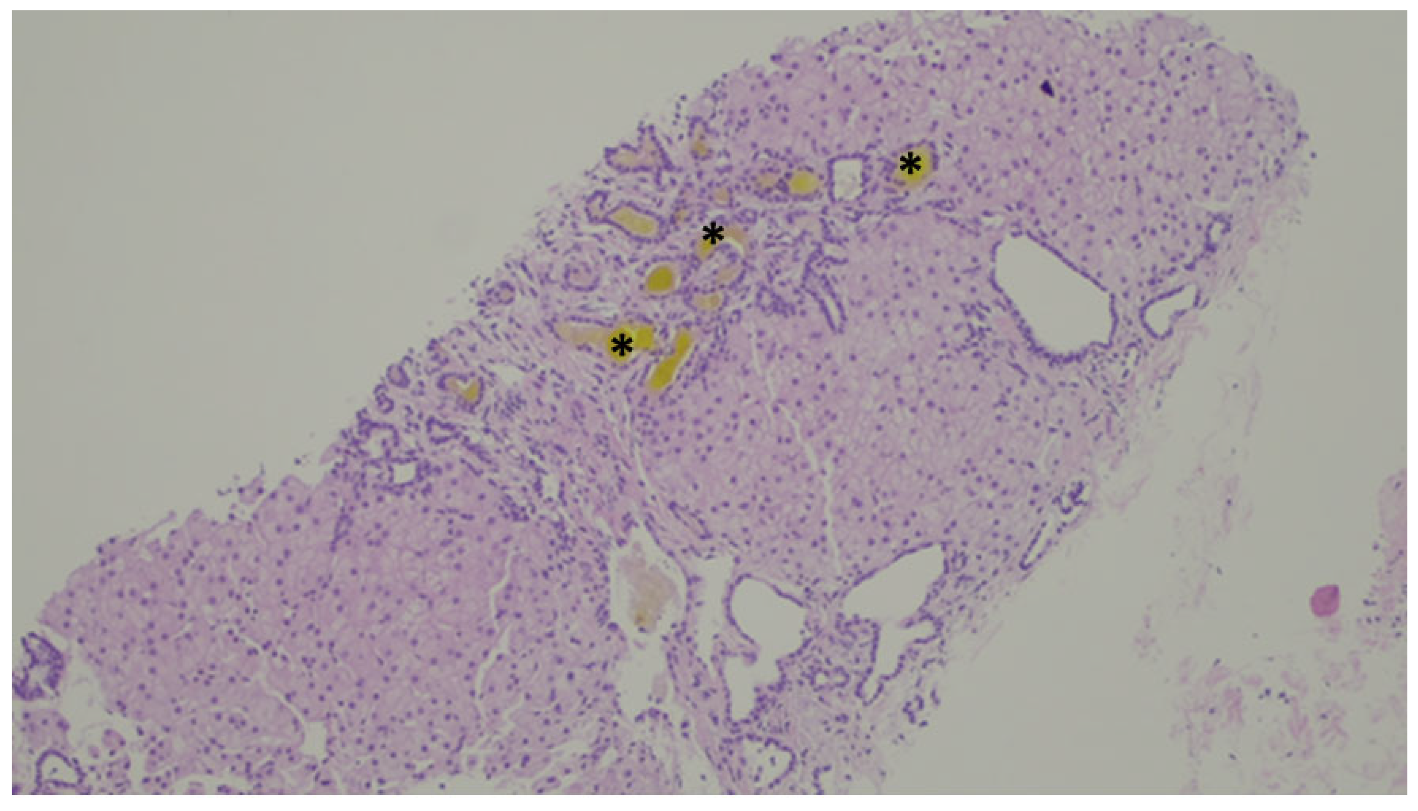 - Shpoliansky, M.; Tobar, A.; Mozer-Glassberg, Y.; Rosenfeld Bar-Lev, M.; Shamir, R.; Shafir, M.; Gurevich, M.; Waisbourd-Zinman, O. Portal plate bile duct diameter in biliary atresia is associated with long-term outcome. Pediatr. Surg. Int. 2022, 38, 825–831. [Google Scholar] [CrossRef] [PubMed]