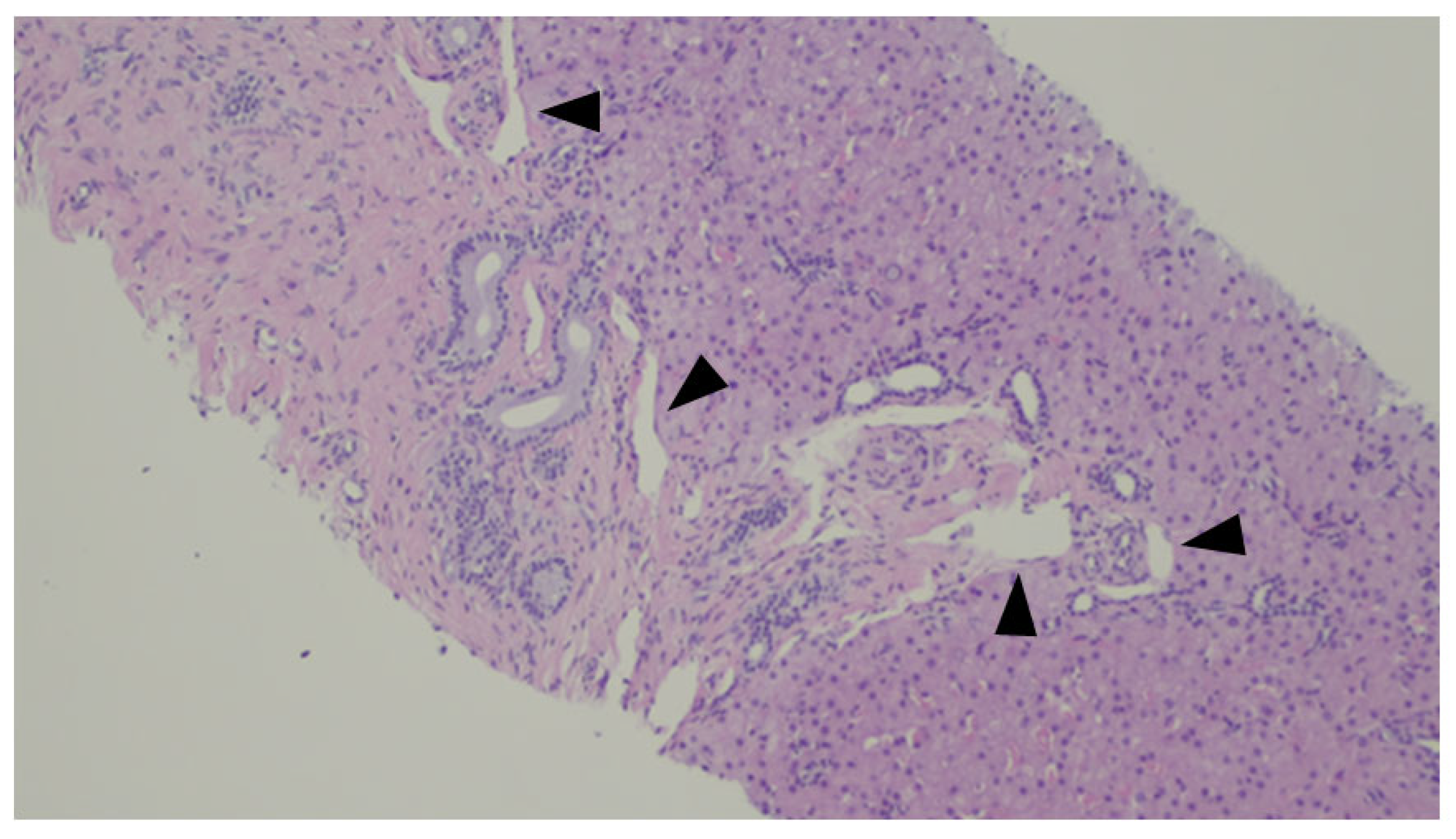 - Dhole, S.D.; Kher, A.S.; Ghildiyal, R.G.; Tambse, M.P. Chronic Liver Diseases in Children: Clinical Profile and Histology. J. Clin. Diagn. Res. JCDR 2015, 9, SC04–SC07. [Google Scholar] [CrossRef]
