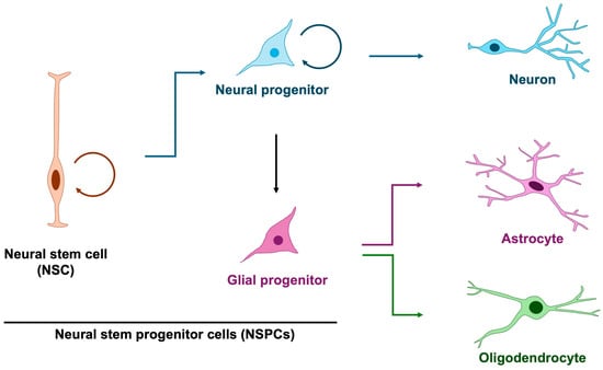 Among the earliest processes in brain formation is the proliferation of embryonic cortical neural stem and progenitor cells (NSPCs), which give rise to the neurons and glial cells that populate the central nervous system [5,7,8]. In principle, neural stem cells generate neural progenitors that predominantly give rise to neurons, whereas glial progenitors are thought to exclusively produce astrocytes and oligodendrocytes (Figure 1). However, it has revealed that neural progenitor cells exhibit glial characteristics and are capable of producing not only neurons but also astrocytes and oligodendrocytes [9], thereby blurring the distinction between dedicated glial progenitors and multipotent neural progenitors. Notably, neurogenesis precedes gliogenesis, commencing at approximately embryonic day 10 in mice (gestational week 10 in humans) and shifting toward gliogenesis around embryonic day 16 in mice (gestational week 16 in humans) [10,11,12]. This temporal progression indicates a dynamic change in the developmental potential of neural progenitor cells. Although mounting evidence implicates glial abnormalities in NDDs [13,14], the specific contribution of aberrant gliogenesis remains less well defined. Accordingly, in this review, we highlight defective NSPC proliferation and its relevance to the pathogenesis of NDDs.