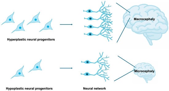 NSPCs are highly sensitive to both intrinsic and extrinsic cues that govern their proliferation, survival, and differentiation [15,16,17,18]. Tight regulation of NSPC expansion and lineage specification is indispensable for the proper establishment of brain size, cortical lamination, and neural circuitry [19,20,21,22]. Disruptions in these processes can yield profound neuroanatomical and functional abnormalities, exemplified by microcephaly and macrocephaly [23,24,25], as well as aberrant synaptic organization frequently observed in neurodevelopmental disorders [26] (Figure 2). It is estimated that 15–79% of individuals with NDDs exhibit comorbid microcephaly [27,28], while 54–67% of patients with microcephaly present with NDDs [27,29], indicating that microcephaly constitutes a frequent and clinically significant comorbidity of NDDs. Furthermore, approximately 16–22% of individuals with NDDs display comorbid macrocephaly [30,31], and 17% of patients with macrocephaly are diagnosed with NDDs [32], suggesting that macrocephaly also represents a relatively common and noteworthy comorbid condition, albeit with a weaker correlation compared to microcephaly.