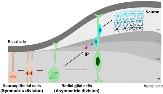 The earliest NSPCs in the developing brain are neuroepithelial cells, a population of neural stem cells that initially undergo symmetric divisions to expand the progenitor pool during early neurogenesis [7]. As the neural tube matures, these neuroepithelial cells progressively transform into radial glial cells—highly polarized progenitors that extend across the entire thickness of the embryonic cortex. Radial glia generate both neurons and intermediate progenitors through symmetric and asymmetric divisions [39]. Intermediate progenitors (IPs), residing predominantly within the subventricular zone, possess more restricted developmental potential and primarily give rise to neurons via neurogenic divisions [40,41] (Figure 3).