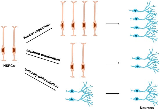Effects of NSPC proliferation and differentiation on neuronal number. Normal expansion of NSPCs ensures the proper production of mature neurons. In contrast, impaired proliferation or premature differentiation of NSPCs results in a marked reduction in neuronal numbers. NSPCs, neural stem and progenitor cells.