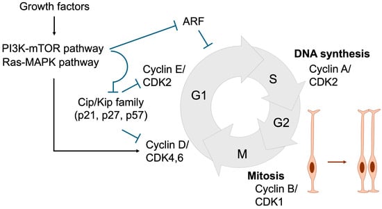 Proper and timely cell division is tightly regulated through coordinated control of cell cycle progression. During the G1 phase, diploid cells prepare for DNA synthesis, which occurs in the S phase. The resulting tetraploid cells then enter the G2 phase, where they prepare for mitosis, ultimately producing two daughter cells in the M phase [43,53,54] (Figure 5). In response to growth factors described in Section 2, signaling cascades such as the MAPK and PI3K/mTOR pathways are activated, leading to the induction of Cyclin D. Cyclin D subsequently activates CDK4/6, which is required for entry into S phase and DNA replication. Cyclin D–CDK4/6 activity further induces Cyclin E, which activates CDK2 to drive G1 phase progression. Thereafter, the Cyclin A–CDK2 complex plays a pivotal role in initiating DNA replication by activating the replication machinery, while also coordinating the timely activation of the Cyclin B–CDK1 complex, which governs progression into mitosis.