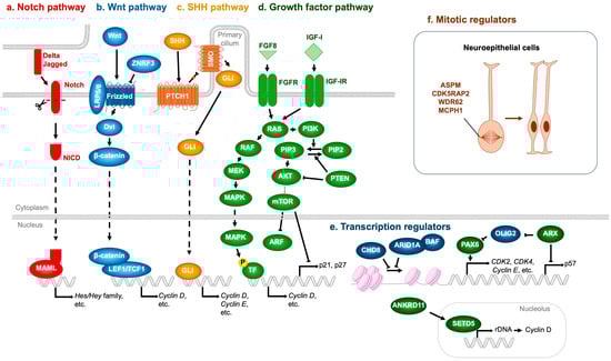 Molecular regulators whose mutations contribute to impaired NSPC proliferation and NDDs. (a) Notch pathway. Ligands expressed on adjacent cells (Delta, Jagged) activate the Notch receptor, generating the Notch intracellular domain (NICD), which associates with MAML to induce the transcription of Hes and Hey family genes. (b) Wnt pathway. Wnt ligands bind to the LRP5/6–Frizzled receptor complex, recruiting Dvl and stabilizing β-catenin, which translocates into the nucleus and binds to LEF1/TCF1 transcription factors to promote target gene expression, including Cyclin D. ZNRF3 acts as a negative regulator by ubiquitinating and degrading Frizzled receptors. (c) SHH pathway. Binding of SHH to PTCH1 relieves its inhibition of SMO, enabling GLI transcription factors to enter the nucleus and activate downstream genes such as Cyclin D and Cyclin E. (d) Growth factor pathway. Representative ligands such as FGF8 and IGF-I activate their respective receptors (FGFR and IGF-IR), initiating downstream cascades. The RAS–MAPK pathway (RAS → RAF → MEK → MAPK) promotes transcription of Cyclin D, whereas the PI3K–mTOR pathway (PI3K → AKT → mTOR) suppresses cell cycle inhibitors including ARF, p21, and p27. (e) Transcription regulators. The CHD8 and ARID1A-containing BAF complex represses, whereas PAX6 enhances, the transcription of cell cycle activators such as CDK2, CDK4, and Cyclin E. ARX indirectly upregulates PAX6 expression through OLIG2 repression and concurrently inhibits the expression of the cell cycle inhibitor p57. Furthermore, ANKRD11 enhances rDNA transcription and subsequently induces Cyclin D expression via SETD5 upregulation. (f) Mitotic regulators. ASPM, CDK5RAP2, WDR62, and MCPH1 are essential for proper mitotic spindle assembly, thereby ensuring accurate neuroepithelial cell division. T-shaped arrows represent inhibition, whereas dotted arrows denote indirect activation. Orange arrow represents the proliferation of neural stem cells.