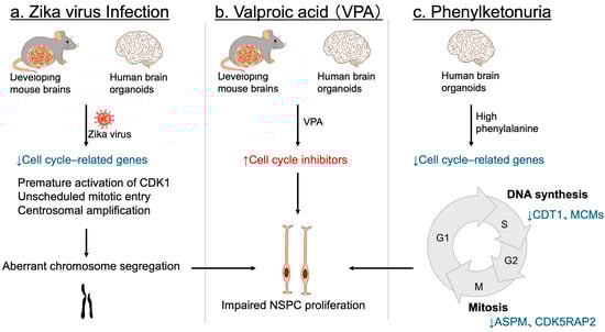 Environmental factors leading to impaired NSPC proliferation and NDDs. (a) In both mouse embryonic brains and human cerebral organoids, Zika virus infection disrupts the expression of key cell cycle regulators. It also triggers premature CDK1 activation, unscheduled mitotic entry, and centrosomal amplification, resulting in aberrant chromosome segregation, and subsequent impairment of NSPC proliferation. (b) Valproic acid (VPA) exposure. In both mouse models and human brain organoids, exposure to VPA upregulates cell cycle inhibitors, thereby suppressing NSPC proliferation. (c) Phenylketonuria. In human brain organoids, elevated phenylalanine concentrations downregulate genes essential for cell cycle progression—such as CDT1 and MCM family members involved in the S phase, and ASPM and CDK5RAP2 associated with the M phase—ultimately leading to defective NSPC proliferation. Blue arrows and letters denote downregulation, whereas red arrows and letters indicate upregulation.
