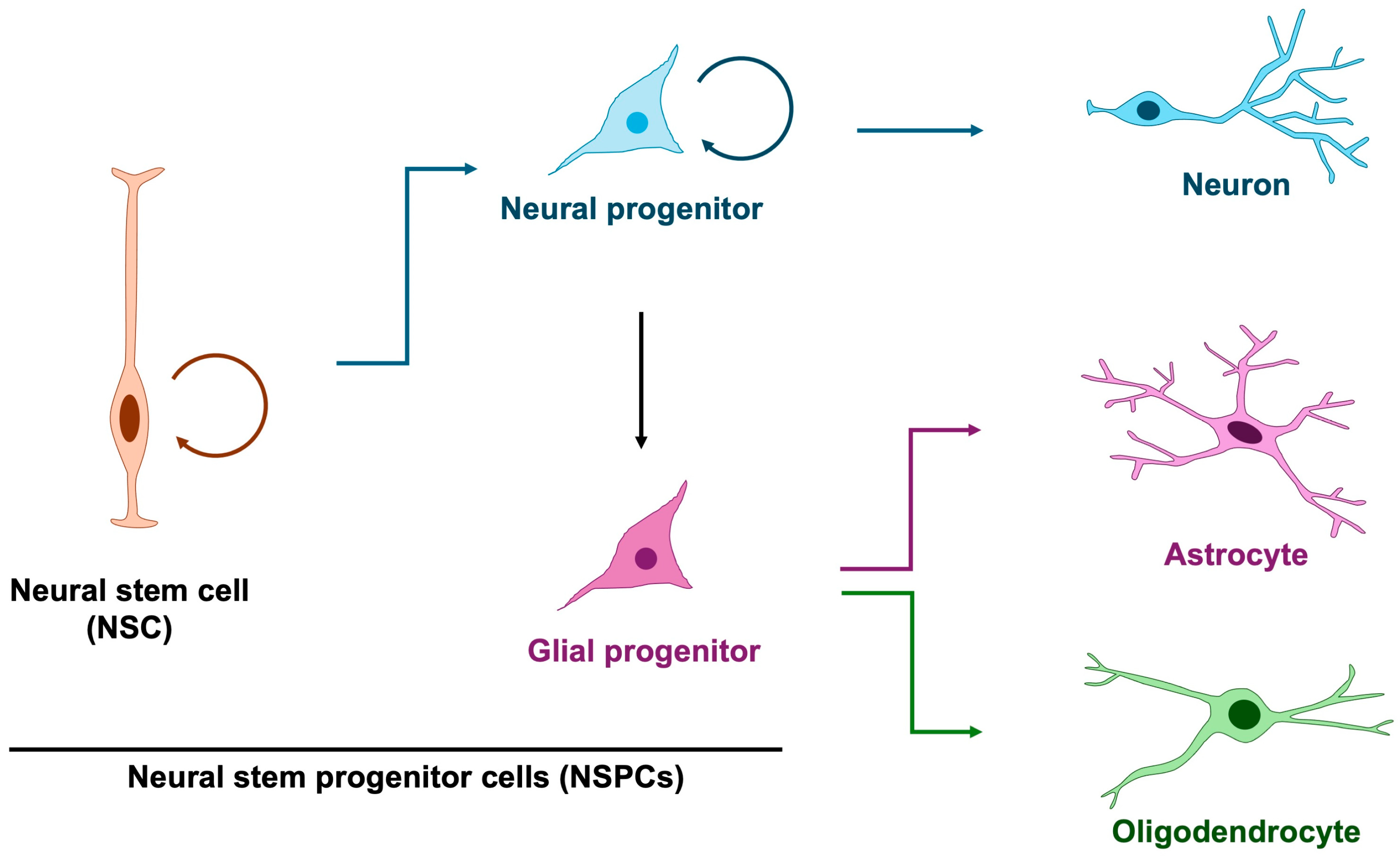 Figure 1. Differentiation trajectory of neuron, astrocyte and oligodendrocyte. In principle, glial cells arise from glial progenitors; however, studies on neural stem and progenitor cells have demonstrated that neural progenitors themselves exhibit glial-like properties and can also function as glial progenitors. Three-quarter circular arrows denote self-renewal. Blue arrows indicate neurogenesis, purple arrows represent astrogenesis, and green arrows denote oligodendrogenesis.