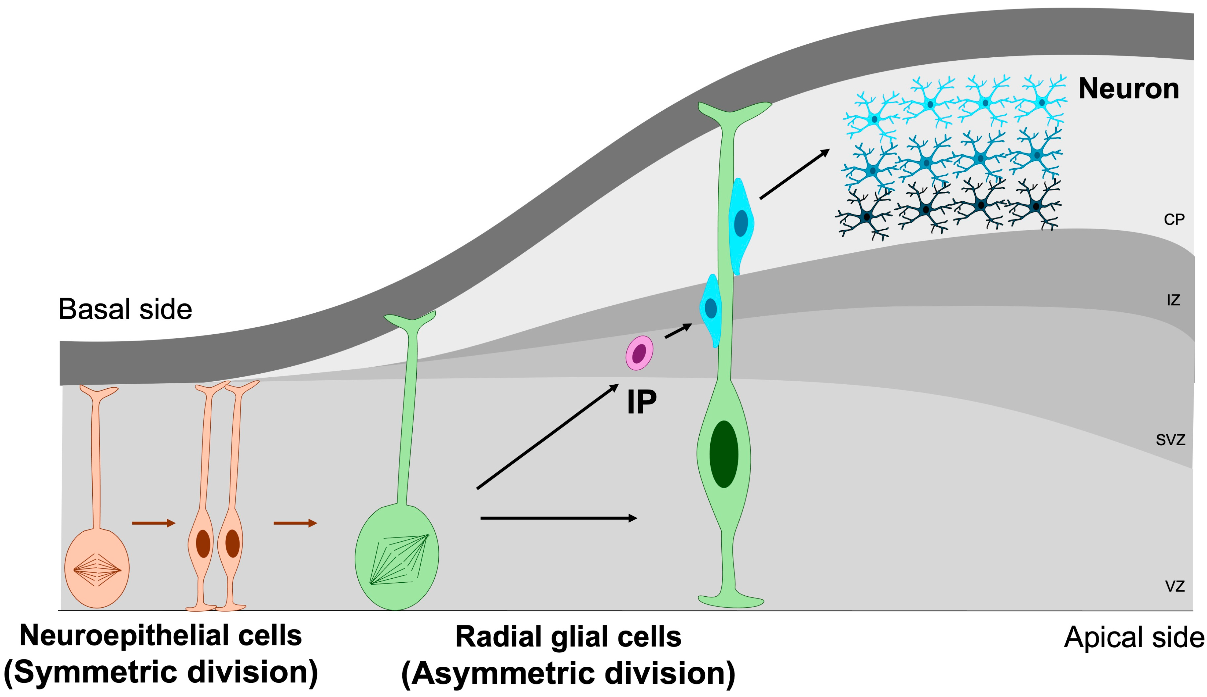Figure 3. Symmetric and asymmetric division of NSPCs. Symmetric division is essential for maintaining the NSPC pool through self-renewal, whereas asymmetric division drives the generation of differentiated neuronal lineages. IP, intermediate progenitor; VZ, ventricular zone; SVZ, subventricular zone; IZ, intermediate zone; CP, cortical plate. Orange cells represent neuroepithelial cells, green cells denote radial glial cells, purple cells correspond to intermediate progenitors, and blue cells indicate mature neurons. Orange arrows indicate the differentiation of neuroepithelial cells, whereas green arrows represent the differentiation of radial glial cells.