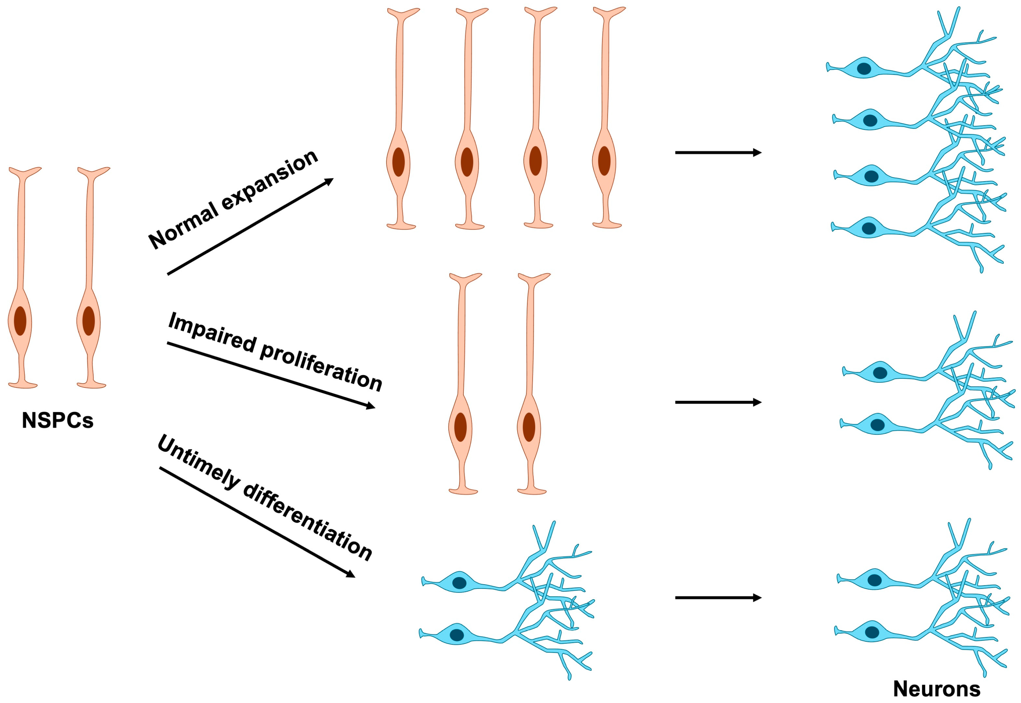 Figure 4. Effects of NSPC proliferation and differentiation on neuronal number. Normal expansion of NSPCs ensures the proper production of mature neurons. In contrast, impaired proliferation or premature differentiation of NSPCs results in a marked reduction in neuronal numbers. NSPCs, neural stem and progenitor cells.