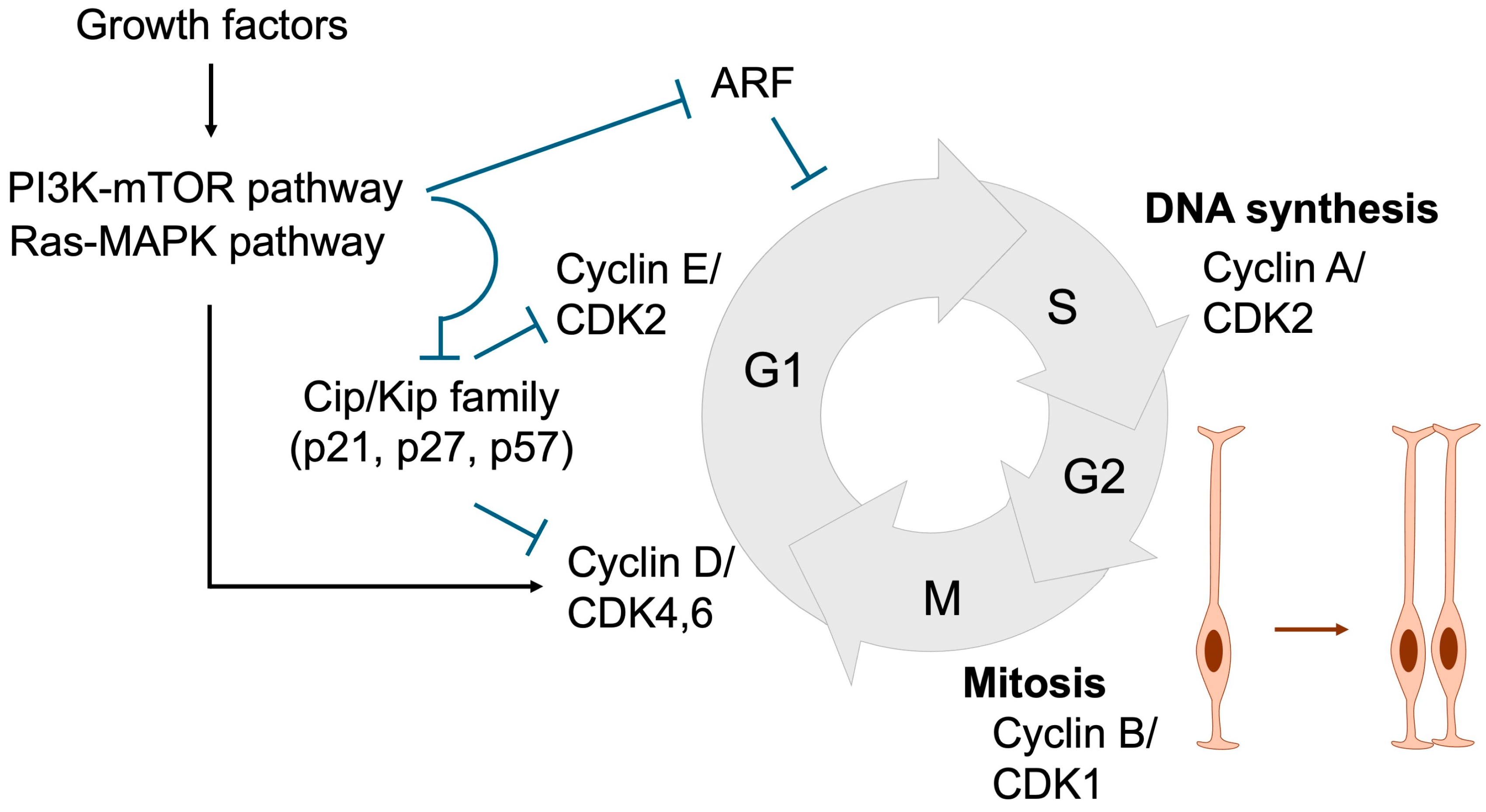 Figure 5. Cell cycle regulation essential for NSPC expansion. During the G1 phase, Cyclin D and Cyclin E are sequentially expressed, resulting in the activation of CDK4/6 and CDK2. Growth factors promote G1 phase progression by inducing Cyclin D expression and suppressing Cip/Kip family CDK inhibitors (p21, p27, and p57) through the Ras-MAPK and PI3K-mTOR signaling pathways, respectively. ARF also acts as a negative regulator of G1 progression. In the S phase, Cyclin A expression activates CDK2, thereby initiating DNA replication. During the G2 phase, Cyclin B accumulation leads to CDK1 activation, which governs entry into and progression through the M phase, where cell division occurs. Black arrows denote activation, whereas blue T-shaped arrows represent inhibition. Orange arrow represents the proliferation of neural stem cells.