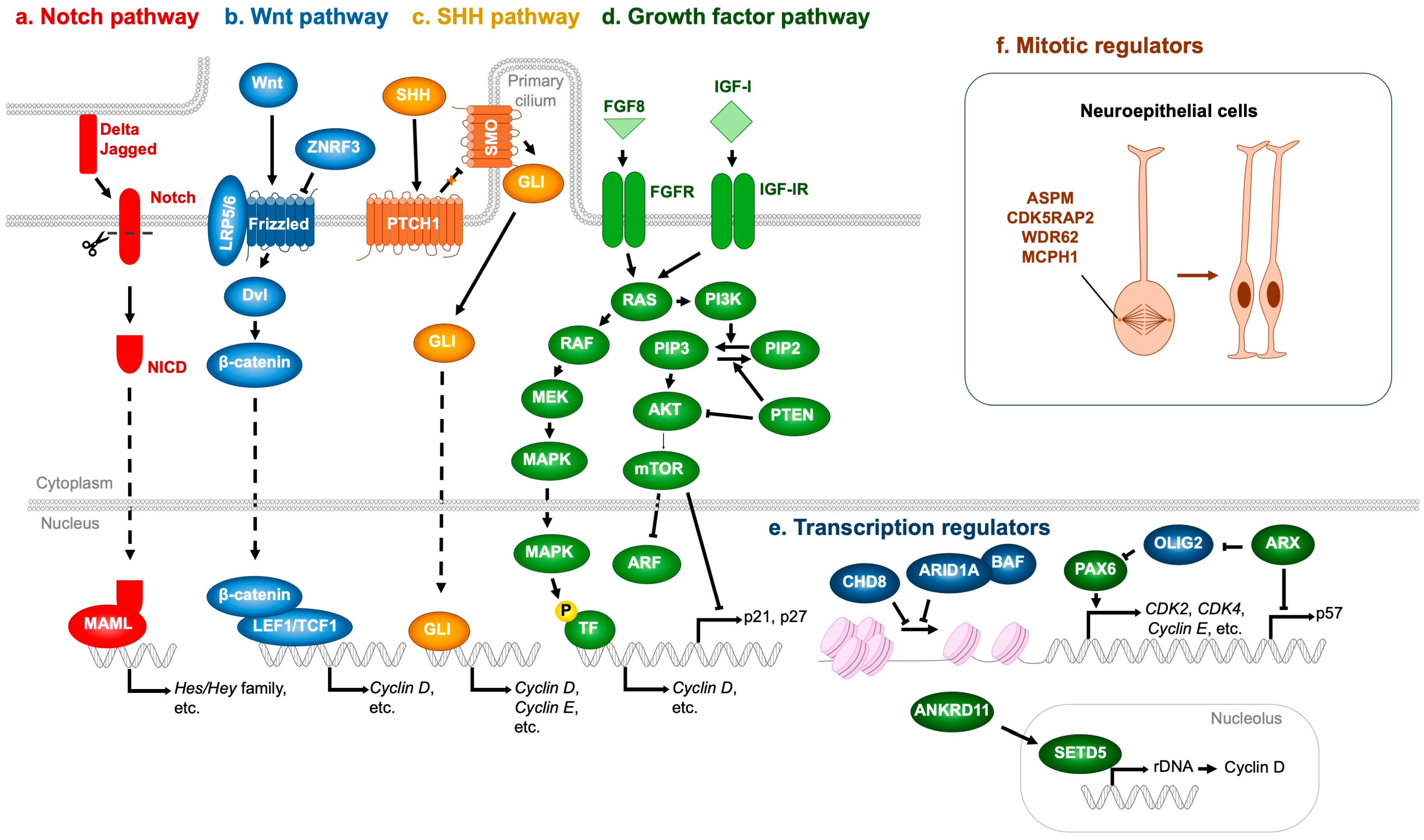 Figure 6. Molecular regulators whose mutations contribute to impaired NSPC proliferation and NDDs. (a) Notch pathway. Ligands expressed on adjacent cells (Delta, Jagged) activate the Notch receptor, generating the Notch intracellular domain (NICD), which associates with MAML to induce the transcription of Hes and Hey family genes. (b) Wnt pathway. Wnt ligands bind to the LRP5/6–Frizzled receptor complex, recruiting Dvl and stabilizing β-catenin, which translocates into the nucleus and binds to LEF1/TCF1 transcription factors to promote target gene expression, including Cyclin D. ZNRF3 acts as a negative regulator by ubiquitinating and degrading Frizzled receptors. (c) SHH pathway. Binding of SHH to PTCH1 relieves its inhibition of SMO, enabling GLI transcription factors to enter the nucleus and activate downstream genes such as Cyclin D and Cyclin E. (d) Growth factor pathway. Representative ligands such as FGF8 and IGF-I activate their respective receptors (FGFR and IGF-IR), initiating downstream cascades. The RAS–MAPK pathway (RAS → RAF → MEK → MAPK) promotes transcription of Cyclin D, whereas the PI3K–mTOR pathway (PI3K → AKT → mTOR) suppresses cell cycle inhibitors including ARF, p21, and p27. (e) Transcription regulators. The CHD8 and ARID1A-containing BAF complex represses, whereas PAX6 enhances, the transcription of cell cycle activators such as CDK2, CDK4, and Cyclin E. ARX indirectly upregulates PAX6 expression through OLIG2 repression and concurrently inhibits the expression of the cell cycle inhibitor p57. Furthermore, ANKRD11 enhances rDNA transcription and subsequently induces Cyclin D expression via SETD5 upregulation. (f) Mitotic regulators. ASPM, CDK5RAP2, WDR62, and MCPH1 are essential for proper mitotic spindle assembly, thereby ensuring accurate neuroepithelial cell division. T-shaped arrows represent inhibition, whereas dotted arrows denote indirect activation. Orange arrow represents the proliferation of neural stem cells.