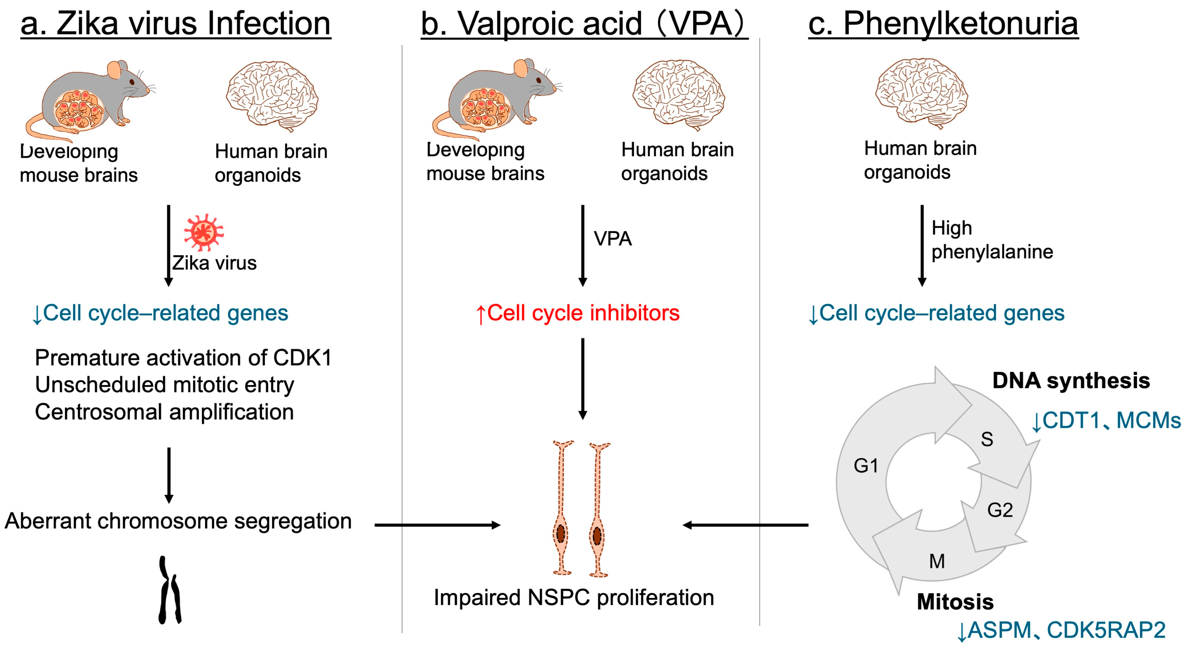 Figure 7. Environmental factors leading to impaired NSPC proliferation and NDDs. (a) In both mouse embryonic brains and human cerebral organoids, Zika virus infection disrupts the expression of key cell cycle regulators. It also triggers premature CDK1 activation, unscheduled mitotic entry, and centrosomal amplification, resulting in aberrant chromosome segregation, and subsequent impairment of NSPC proliferation. (b) Valproic acid (VPA) exposure. In both mouse models and human brain organoids, exposure to VPA upregulates cell cycle inhibitors, thereby suppressing NSPC proliferation. (c) Phenylketonuria. In human brain organoids, elevated phenylalanine concentrations downregulate genes essential for cell cycle progression—such as CDT1 and MCM family members involved in the S phase, and ASPM and CDK5RAP2 associated with the M phase—ultimately leading to defective NSPC proliferation. Blue arrows and letters denote downregulation, whereas red arrows and letters indicate upregulation.