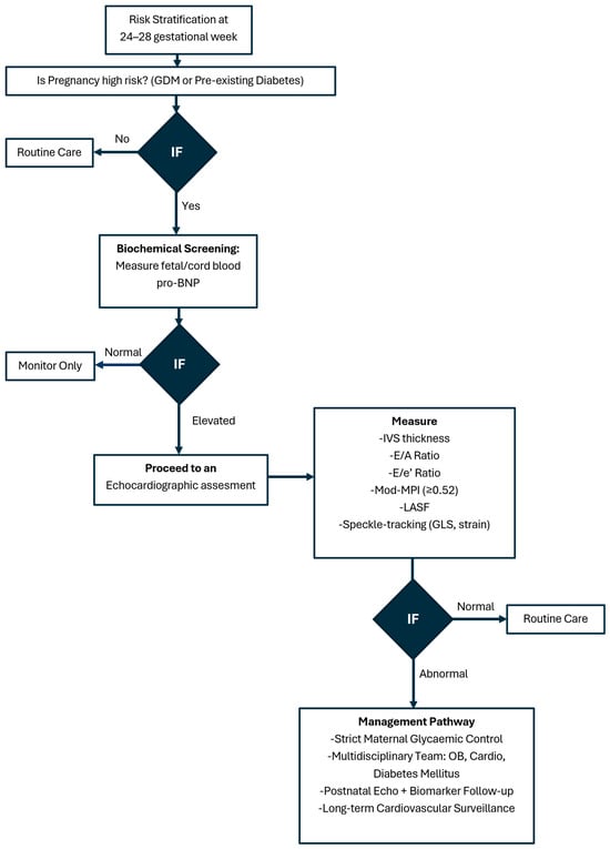 The study of Halse K.G. et al. undertook a comprehensive evaluation of cardiac dysfunction in neonates born from diabetic mothers, assessing both serological and morphological indicators alongside fetal ECG monitoring during labor. In the study, 99 pregnant women with diabetes (30 with type 1, 9 with type 2, and 60 with GDM) were included. The newborns were examined using a combination of umbilical cord blood pro-brain natriuretic peptide (pro-BNP) levels, echocardiographic measurements, and fetal ECG with STAN technology. Higher pro-BNP concentrations in umbilical cord blood were strongly associated with greater neonatal interventricular septal thickness (p = 0.025), which suggests a link between elevated cardiac stress markers and hypertrophic myocardial remodeling. Additionally, lower umbilical cord blood pH values correlated negatively with pro-BNP levels (p = 0.036), reinforcing the notion that metabolic acidosis may be tied to increased fetal cardiac strain [16]. Abnormal fetal ECG changes (STAN events) showed no significant correlations with either pro-BNP levels or neonatal interventricular septal hypertrophy, signifying that while ECG alterations might reflect fetal cardiac distress, they may not serve as sensitive predictive markers of structural myocardial remodeling in neonates [17].