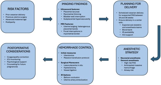 One observational study over a 15-year period examined peripartum maternal admission to the ICU. Among the leading causes of ICU admission, PPH led to the admission of 92 women (25.2%), of which 25 (27.2%) of cases were PAS-related complications. The correlation value of placenta percreta/increta was 0.96, meaning there was a strong increase in the number of PAS patients admitted to the ICU as the 15-year period progressed. PAS patient ICU admission represented the steepest trend of the other admission indications [109]. The need for critical care for the PAS patient population is evidenced by the rising incidence of PAS. The risk of hemorrhagic shock and instability requiring further RBC transfusion, and potentially continued mechanical ventilation, highlights the importance of continued monitoring and ICU-level care [110]. To support point-of-care decision-making, Figure 2 presents an integrated flowchart spanning suspicion for PAS, diagnostic imaging, delivery planning, anesthetic approach, and hemorrhage control strategies.