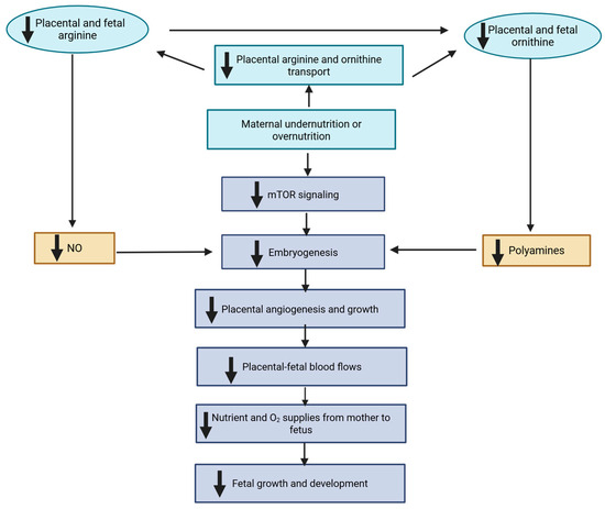 Balanced maternal nutrition is essential for optimal fetal growth, placental development, and long-term health outcomes. Both undernutrition and overnutrition during gestation can disrupt key physiological and molecular pathways, impair fetal development, and lead to lasting postnatal consequences. These imbalances influence nutrient transfer, placental vascularization, and cellular signaling systems that regulate embryogenesis and fetal organogenesis. As illustrated in mechanistic models of maternal under- and overnutrition in Figure 1, both extremes of nutrient supply reduce placental and fetal concentrations of arginine and ornithine, amino acids critical for the synthesis of nitric oxide (NO) and polyamines. These molecules are essential for vascular development, angiogenesis, and trophoblast growth, and disruptions in their synthesis compromise placental blood flow and nutrient delivery. Mechanistically, nutrient restriction diminishes placental transport of these amino acids, downregulates nitric oxide synthase activity, and depletes co-factors such as tetrahydrobiopterin—ultimately reducing nitric oxide production. Simultaneously, reduced availability of S-adenosylmethionine (SAM) and diminished ornithine decarboxylase activity impair polyamine biosynthesis. These combined effects lead to suppression of the mTOR signaling pathway, a central regulator of nutrient sensing and cell growth, thereby further compromising placental function and embryonic development [6].