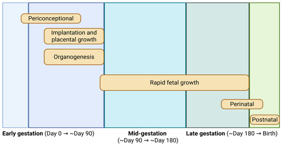 The stage of gestation during which maternal nutritional insults occur plays a pivotal role in determining the nature, magnitude, and persistence of developmental programming effects. Each phase of pregnancy is associated with unique developmental milestones (Figure 2), and disruptions during these windows can yield specific and often irreversible consequences for fetal growth, organogenesis, and long-term physiological function. While the total energy demands of pregnancy increase with advancing gestation, the earliest stages are particularly sensitive to maternal nutritional status. During early gestation—approximately the first 50 days in cattle—the conceptus undergoes rapid cellular proliferation and morphogenesis, transitioning from a single-celled zygote to a structurally organized embryo with developing organ systems and the formation of the placenta [27,51]. This period is marked by high tissue doubling rates and extensive cellular differentiation. Adequate nutrient supply during this phase is essential to support the foundational processes of organ development, tissue patterning, and vascularization of the uteroplacental interface [52]. Recent data indicate that maternal nutrient metabolism undergoes dynamic adaptation during gestation. For instance, a study in sheep demonstrated differential regulation of hepatic and intestinal PI3K/AKT/mTOR signaling across pregnancy stages, reflecting tissue- and stage-specific metabolic remodeling in response to gestation [53]. Nutritional deficits during early pregnancy can disrupt the formation and function of the placenta, impair critical pathways in organ development, and alter the epigenetic landscape of the fetus. Importantly, such changes may not manifest as low birth weight, yet they can result in enduring alterations in metabolic capacity, endocrine regulation, and immune competence [54]. Several studies have shown that maternal stressors—whether nutritional, metabolic, or environmental—during this early window can program offspring for reduced postnatal growth, altered glucose and lipid metabolism, and increased susceptibility to disease, independent of birth weight [55,56].