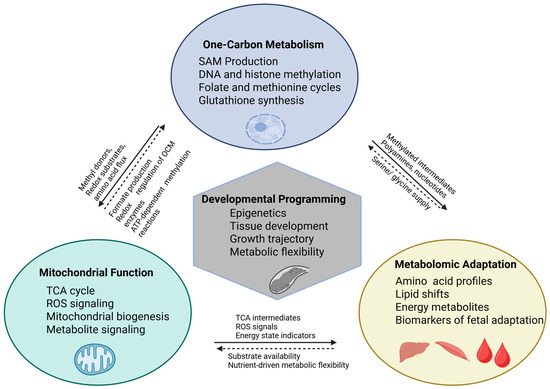 Additionally, mitochondria readily respond to OCM-derived substrates, including SAM, folate-linked one-carbon units, and redox cofactors, which directly influence mitochondrial respiration, antioxidant capacity, and metabolic signaling [97]. In turn, mitochondria regulate OCM activity through redox balance, formate production, and ROS-mediated control of methylation reactions. Mitochondrial dysfunction alters levels of TCA intermediates, acylcarnitines, and redox metabolites [98], which may also affect nutrient-restricted ruminant fetuses. These metabolite shifts feed back into OCM by modifying serine, glycine, and methionine availability as well as the cellular methylation potential [99]. Thus, mitochondrial bioenergetics act as a central integrator linking maternal nutrient supply, OCM flux, and the metabolomic phenotype underlying developmental programming. Because these mitochondrial and epigenetic alterations are established during critical developmental windows [100], the resulting metabolic signatures may persist into postnatal life and, and also, may extend into subsequent generations through maternal inheritance.