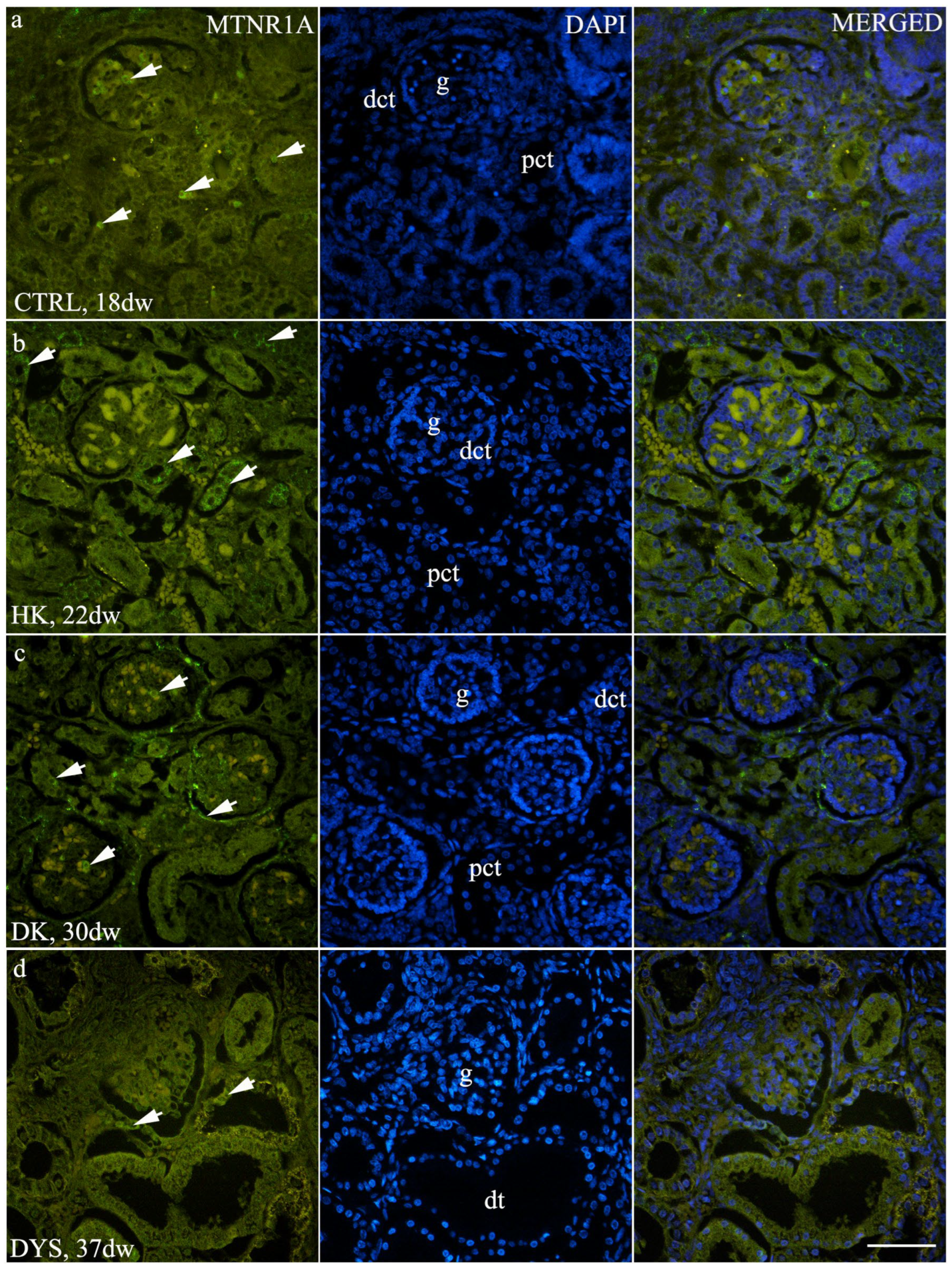 - Drew, J.E.; Williams, L.M.; Hannah, L.T.; Barrett, P.; Abramovich, D.R. Melatonin receptors in the human fetal kidney: 2-[125I]iodomelatonin binding sites correlated with expression of Mel1a and Mel1b receptor genes. J. Endocrinol. 1998, 156, 261–267. [Google Scholar] [CrossRef] [PubMed]
