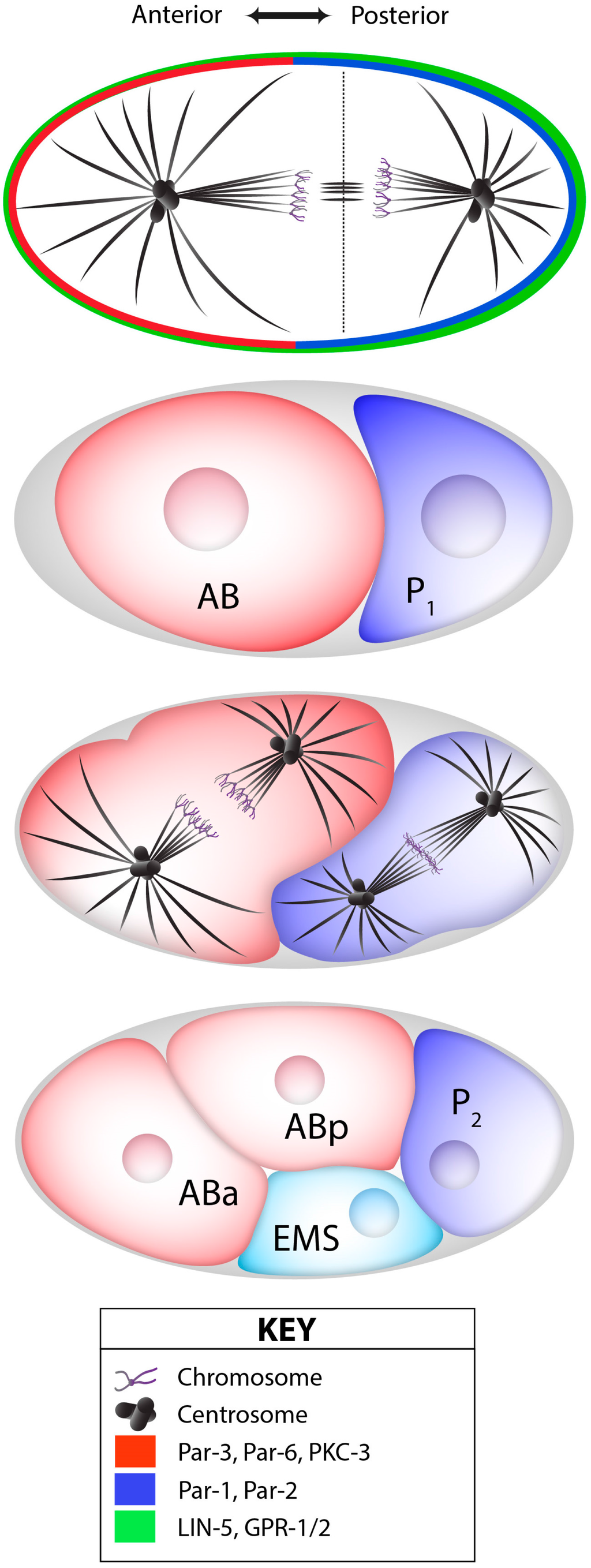 Oriented cell division in the C. elegans zygote. The first zygotic division in C. elegans proceeds asymmetrically to generate differential AB and P1 cells. Par proteins in the zygote are polarized along an anterior-posterior cortical axis: the anteriorally-localized Par-3/Par-6/aPKC (red) and posteriorally-localized Par-1/Par-2 (blue) complexes mutually repress cortical localization of one another. Spindle orientation along this polarity axis is regulated by the GPR-1/2 and LIN-5 complex (which is enriched at the posterior cortex), ensuring proper asymmetry in polarity protein distribution in daughter cells. This complex also induces a physical, posterior displacement of the spindle apparatus relative to the cell center, thereby generating a size asymmetry in offspring. Spindles in the resulting AB and P1 cells rotate relative to the original zygotic axis in subsequent divisions, yielding further diversification at the four-cell stage. These cells ultimately lead to the production of distinct cell lineages and their associated tissue structures in the developing animal [11].