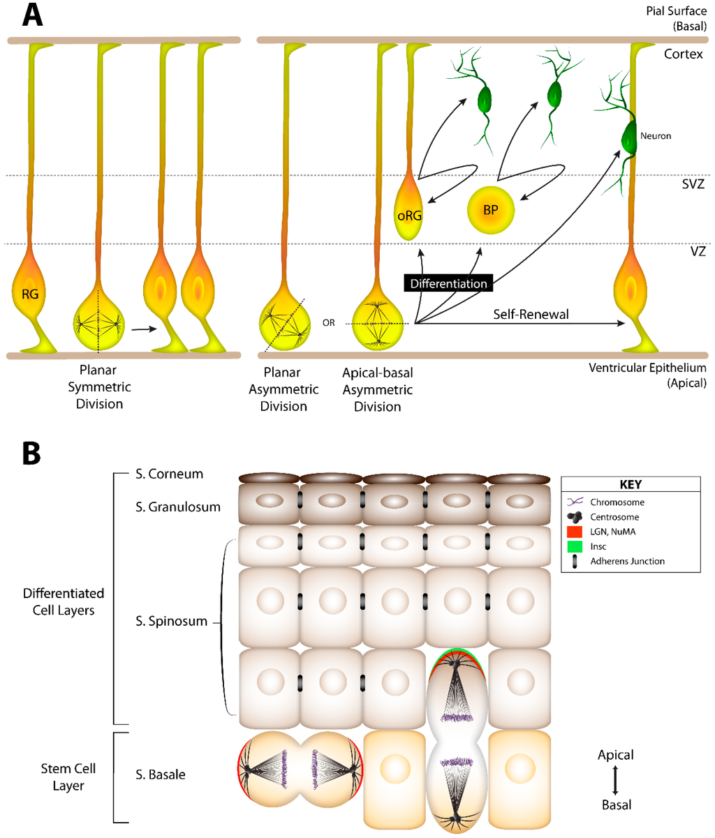 Oriented cell division in mammals. (A) Neurogenesis depends on properly balanced modes of division within radial glial progenitor cells (RG) within the ventricular zone (VZ). Planar symmetric divisions yield two RG cells, whereas asymmetric divisions drive differentiation within the subventricular zone (SVZ) and cortex. These asymmetric divisions are associated with altered spindle orientation relative to the overlying epithelium and produce outer RG (oRG), basal progenitors (BP), or neuron cells; (B) The mouse epidermis also relies on balanced output in mitotic symmetry for development of several differentiated layers. Keratinocyte stem cells in the basal layer undergo symmetric divisions in order to promote tissue growth and expansion. Insc expression induces an apical-basal orientation of cell division that allows for differentiation necessary for tissue stratification. The LGN/NuMA complex is critical for maintaining proper spindle orientation during this process.