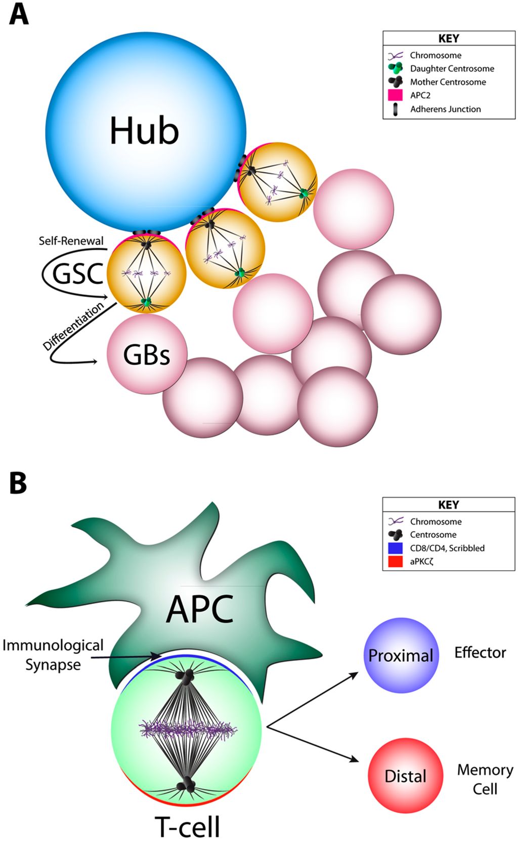 Spindle orientation to cell-adhesion cues. (A) Drosophila male germ line stem cells (mGSCs) form adherens junctions with a central hub cell and orient their mitotic spindles relative to this junction through the activity of the APC2 protein. Following division, the hub-proximal cell retains a stem cell fate, whereas the hub-distal cell becomes a gonial blast (GB) that differentiates further during spermatogenesis. Additionally, the GSC inherits the mother centrosome, while the daughter centrosome is segregated into the GB; (B) T-cell maturation initiates upon interaction with an APC at a specialized cell junction called the immunological synapse, mediated though interactions with CD8/CD4 receptors on the T-cell surface. APC interaction induces cell polarity in the T-cell, with Scribble (Scrib) localizing along the synapse and aPKC along the opposite cortical surface. Spindle orientation relative to the synapse generates a proximal and distal cell that differentiate into the Effector and Memory cell, respectively.