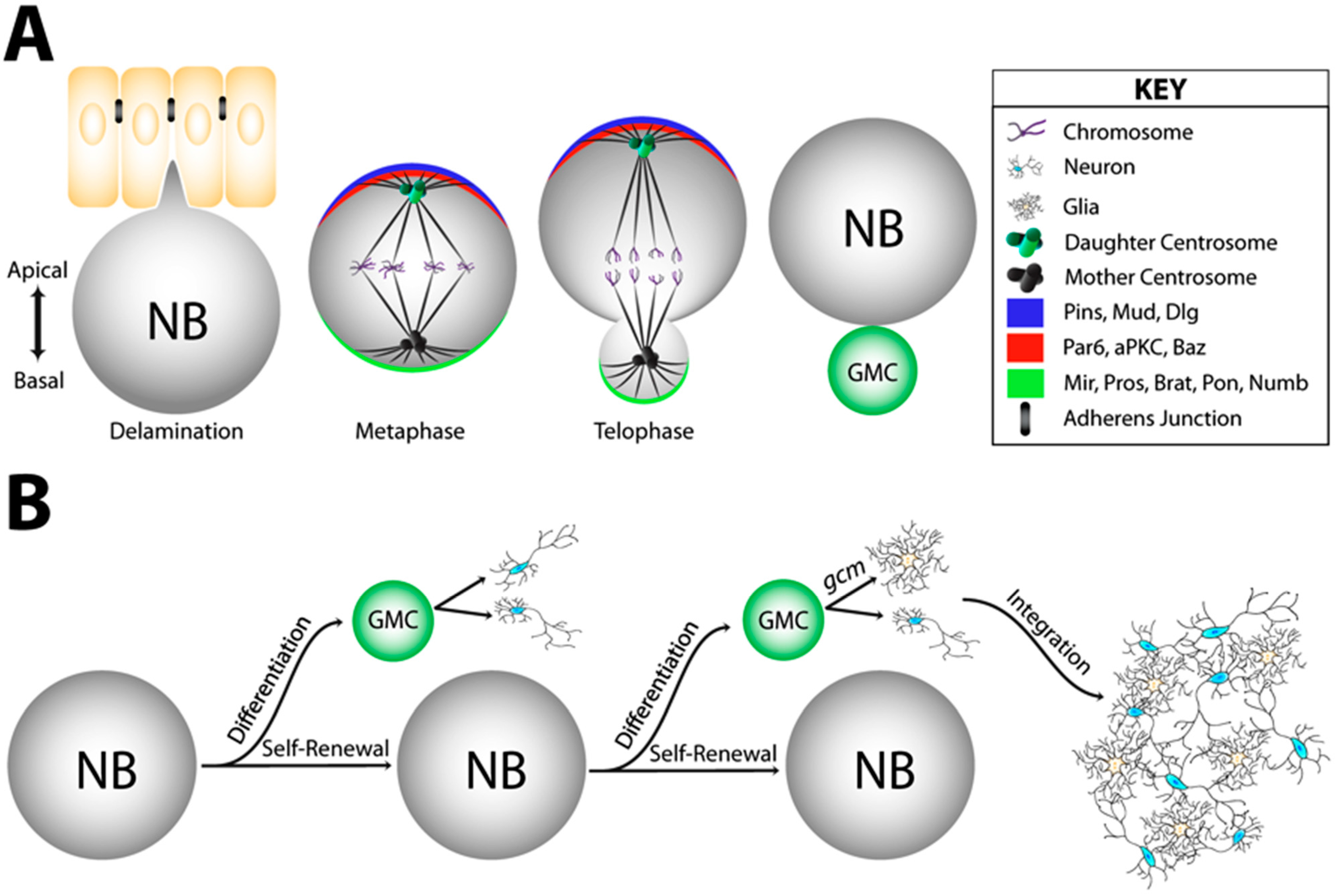 Figure 2. Oriented cell division in Drosophila. (A) Neuroblasts delaminate from the neuroepithelium and establish and apical-basal cortical polarity. The stemness-promoting aPKC enzyme (red) is apically localized and functions to restrict differentiation complexes (green) to the basal cortex. Spindle orientation along this polarity axis is achieved through the function of the apical Pins/Mud/Dlg complex (blue). In addition to asymmetric protein distribution, centrosomes are asymmetrically inherited in daughter cells with the daughter and mother centrosome preferentially segregated in the self-renewed neuroblast and differentiating ganglion mother cell (GMC), respectively; (B) Neuroblast divisions must properly balance self-renewal with differentiation: GMC daughters generate neurons and glial cells that integrate into the functioning central nervous system, whereas the neuroblast pool remains relatively constant throughout development. gcm (glial cells missing) is a gene that is known to regulate glial cell fate in Drosophila. If gcm is upregulated in a GMC daughter cell, it will differentiate into a glial cell [28,29]; (C) Sensory organ precursors (SOPs) produce mechanosensory organs within the developing wing. The initial pI cell polarizes along an anterior-posterior axis and uses two distinct spindle positioning pathways, anterior Pins/Mud and posterior Fz/Dsh, to asymmetrically distribute Numb to the anterior pIIb daughter. Further rounds of oriented divisions, including an Insc-mediated apical-basal division of the pIIb, results in the mature mechanosensory organ structure consisting of five distinct cell fates that function in concert within the adult wing tissue.