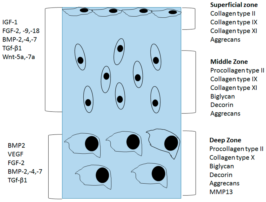 The main function of chondrocytes in the superficial and mid zone is to synthesize ECM composed of collagen type II, IX, and XI and proteoglycans. This ECM facilitates compressional and tensile forces across the diarthrodial joint [9,10]. Collagens are the most abundant macromolecules of the ECM, make up 60% of the dry weight of the cartilage, and provide tensile and shear strength to the tissue. Collagen also stabilizes the matrix. Collagen type II makes up 90%–95% of the collagen in ECM and forms fibrils and fibers interwoven with proteoglycan like aggrecans [10]. Collagens type IX and XI represent 5%–10% of the AC collagenous network and offer support for the collagen fibrilar crosslinking. Chondrocytes of the deep zone are terminally differentiated and actively synthesize collagen type X. Proteoglycans represent the second largest group of macromolecules and are heavily glycosylated protein monomers that resist compressional forces by swelling pressure due to their affinity to water across the articular joint [9]. These proteoglycans include aggrecan, decorin, biglycan, and fibromodulin. Aggrecans are the largest among the group [9,11]. Growth factors play a crucial role in controlling chondrogenesis by affecting MSCs differentiation to chondrocytes. They also influence chondrocytes to synthesize specific ECM proteins (Figure 1). The shift in expression of collagen type X by the chondrocytes also marks the regulation of proteolytic enzymes production. These enzymes aid in the clearing of the cartilage ECM and allow vascularization and calcification of tissue [10,12].