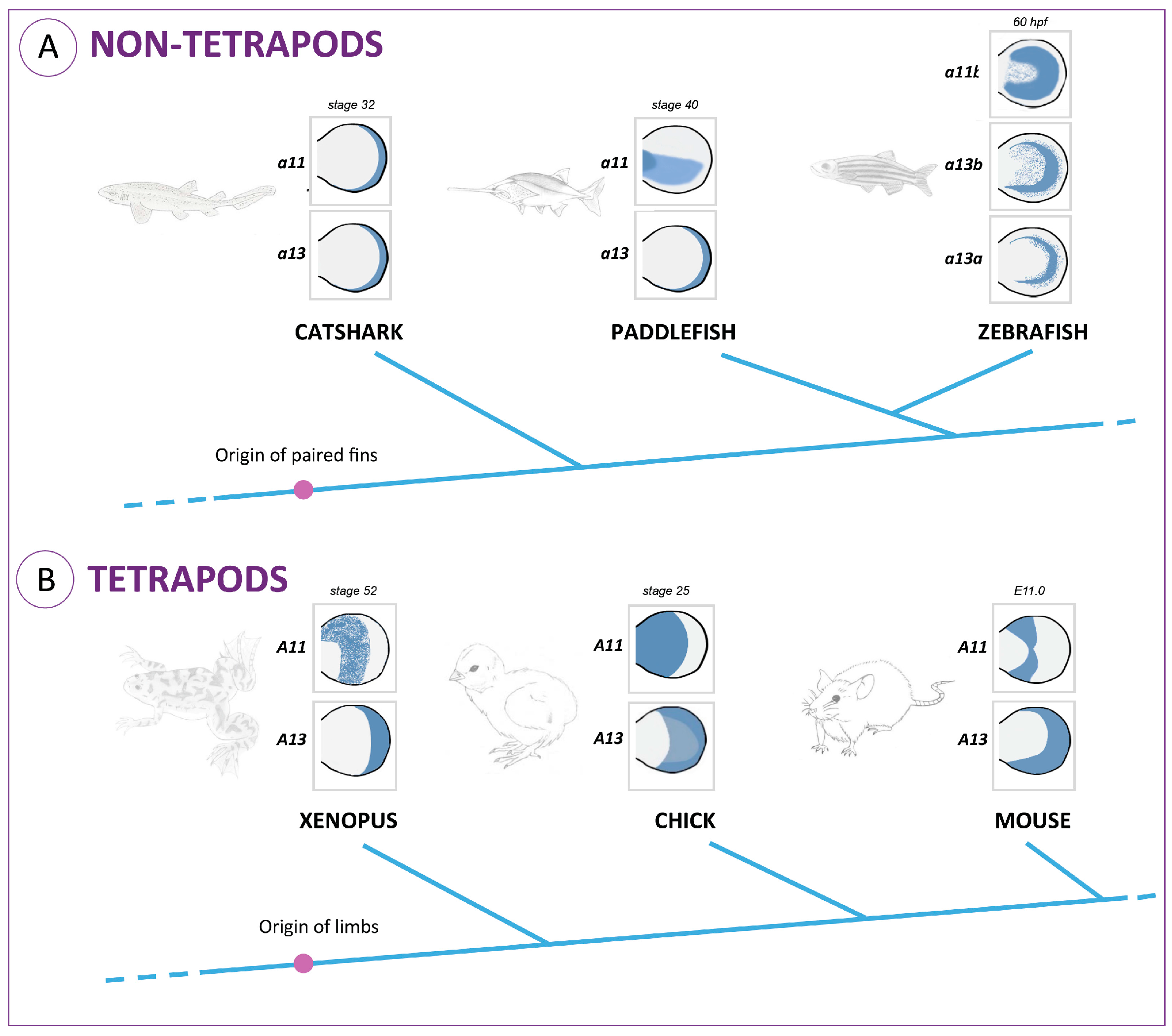 Expression patterns of 5’ HoxA genes during the development of paired appendages in vertebrates. The selection of stages took into account data from: Xenopus [16]; chick [23]; mouse [31]; catshark [35]; paddlefish [36]; zebrafish [17]. (A) Expression domains of HoxA11 and HoxA13 in developing fins from fish representing phylogenetic groups that diverged prior to the origin of tetrapods; (B) Expression domains of HoxA11 and HoxA13 in developing limbs in representatives of tetrapod lineages (in blue).