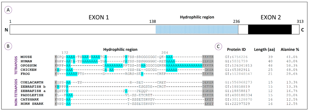 Comparative analyses using HoxA11 amino acid sequences from vertebrates reveal that this protein is composed of three major domains [41]: Domains I and III correspond to the N- and C-terminal regions respectively; Domain II is encoded by exon 1 and corresponds to a variable and overall hydrophilic region (Figure 2A). Characteristic reconstructions of Domains I and III suggest that the rates of coding sequence evolution have not changed significantly in tetrapods (frog and chick) relative to lobe-finned fish (coelacanth). However accelerated rates of coding sequence evolution were observed for the mammalian and newt lineages and shown to be a gene-specific phenomenon [41]. Interestingly, when the hydrophilic region of the HoxA11 proteins is compared, stretches of more than three consecutive alanine residues are identified exclusively in the tetrapod sequences, together with an increase in the length of this region (Figure 2B). Thus, the molecular evolution of this transcription factor might have involved an increase of the hydrophilic region by the addition of polyalanine tracts. An hypothetical scenario is that the alanine repeats present in the common ancestor of tetrapods may have acted as a “seed” for the expansion of polyalanine stretches that then contributed to an increased plasticity of HoxA11, potentiating novel functionalities in this lineage, ultimately contributing to the developmental events involved in the fin-to-limb transition [41].