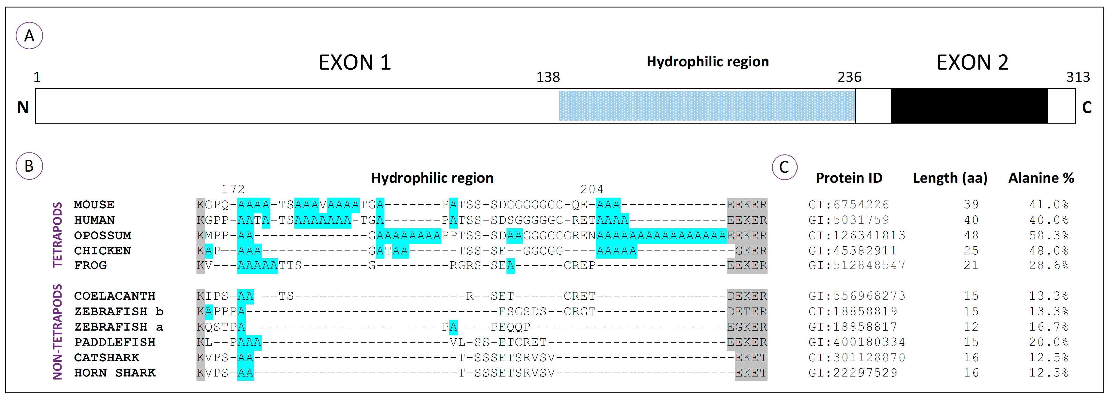 Structure and alanine content of the HoxA11 proteins from vertebrates. (A) Schematic representation of the HoxA11 protein, which has 313 aa (amino acid) based on mouse [41,57]. Exons 1 and 2 are represented by white rectangles; the homeobox is in black; and N and C terminal ends are indicated. The variable overall hydrophilic region (98 aa) identified in the N-terminal region is represented by a dotted bar; (B) Amino acid sequence alignment of the presumptive hydrophilic region of HoxA11 proteins in vertebrates: mouse (Mus musculus), human (Homo sapiens), opossum (Monodelphis domestica), chicken (Gallus gallus), frog (Xenopus tropicalis), coelacanth (Latimeria chalumnae), zebrafish (Danio rerio), paddlefish (Polyodon spathula), catshark (Scyliorhinus canicula) and horn shark (Heterodontus francisci). Alignments were performed with Clustal X [58]. Conserved amino acid residues, flanking the region, are shadowed in grey and alanine residues in blue. Note the presence of polyalanine tracts, with more than four alanine residues clustered, exclusively in tetrapod organisms; (C) Identification of the HoxA11 proteins used in the alignment (Protein ID) and the corresponding alanine percentage within the presumptive hydrophilic regions. The sequences used to calculate the alanine percentage correspond to blocks located between extremely conserved residues (in grey). The length of the compared blocks is also indicated here (aa). Note a significant increase of these blocks and a higher percentage of alanine residues in tetrapod organisms, particularly evident in amniotes. Within non-tetrapods, the higher percentage of alanine is found in paddlefish.