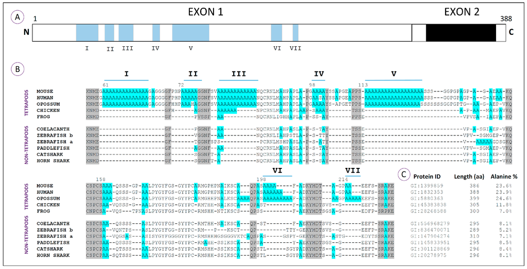 Structure and alanine content of the HoxA13 proteins from vertebrates. (A) Schematic representation of the HoxA13 protein, which has 383 aa (amino acid) based on mouse [47,64]. Exons 1 and 2 are represented by white rectangles; the homeobox is in black; and the N and C terminal ends are indicated. Alanine tracts found in the N-terminal region are represented in blue (I–VII); (B) Amino acid sequence alignment showing the alanine residues (in blue) detected in the N-terminal region of HoxA13 proteins in vertebrates: mouse (Mus musculus), human (Homo sapiens), opossum (Monodelphis domestica), chicken (Gallus gallus), frog (Xenopus tropicalis), coelacanth (Latimeria chalumnae), zebrafish (Danio rerio), paddlefish (Polyodon spathula), catshark (Scyliorhinus canicula) and horn shark (Heterodontus francisci). Note the presence of seven polyalanine tracts (I–VII) exclusively in the mammalian Hoxa13 proteins and conservation of Tract III among amniotes; (C) Identification of the HoxA13 proteins used in the alignment (Protein ID) and the corresponding alanine percentage. Note the higher percentage of alanine residues in amniotes, in particular in mammals.