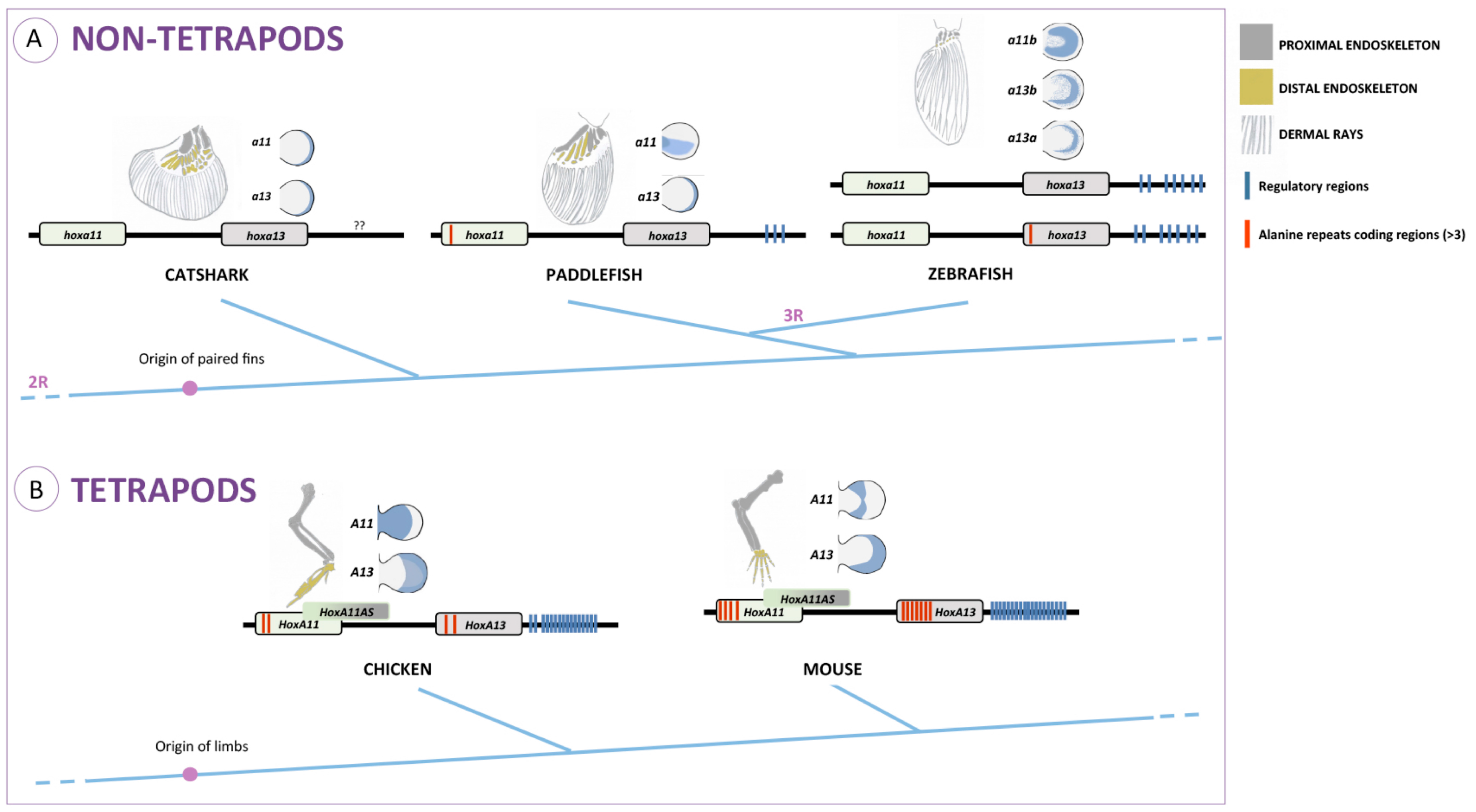 Overview of the morphological, developmental and genomic changes that may have preceded the fin-to-limb transition in vertebrates, comparing non-tetrapod (A) and tetrapod (B) organisms. Schematic drawing of appendicular skeletons from vertebrates representing distinct phylogenetic positions: basal gnathostomes (catshark); basal actinopterygians (paddlefish); teleosts (zebrafish) and tetrapods (mouse and chicken). 2R and 3R refer to the number of whole-genome duplications that took place prior to the divergence of gnathostomes and teleosts, respectively. Panels adjacent to the appendicular skeletons display HoxA11 and HoxA13 expression during appendage development (in blue) based on data from: Xenopus [16]; chick [23]; mouse [31]; catshark [35]; paddlefish [36]; zebrafish [17]. The genomic region thought to contain HoxA11 and HoxA13 genes in each type of organism is represented under these panels. Note the regions encoding for alanine clusters, with a minimum of three residues (in red) and putative regulatory regions in blue. HoxA11AS are the long non-coding HoxA11 RNAs thought to have an inhibitory effect on HoxA11 transcription. Question marks in the basal gnathostome condition represent the lack of knowledge of putative regulatory regions operating on 5’ HoxA genes. The basal actinopterygian condition was assembled based on data from spotted gar (Lepisosteus oculatus). Figure assembly based on [1,40,41,43,57,66,67].