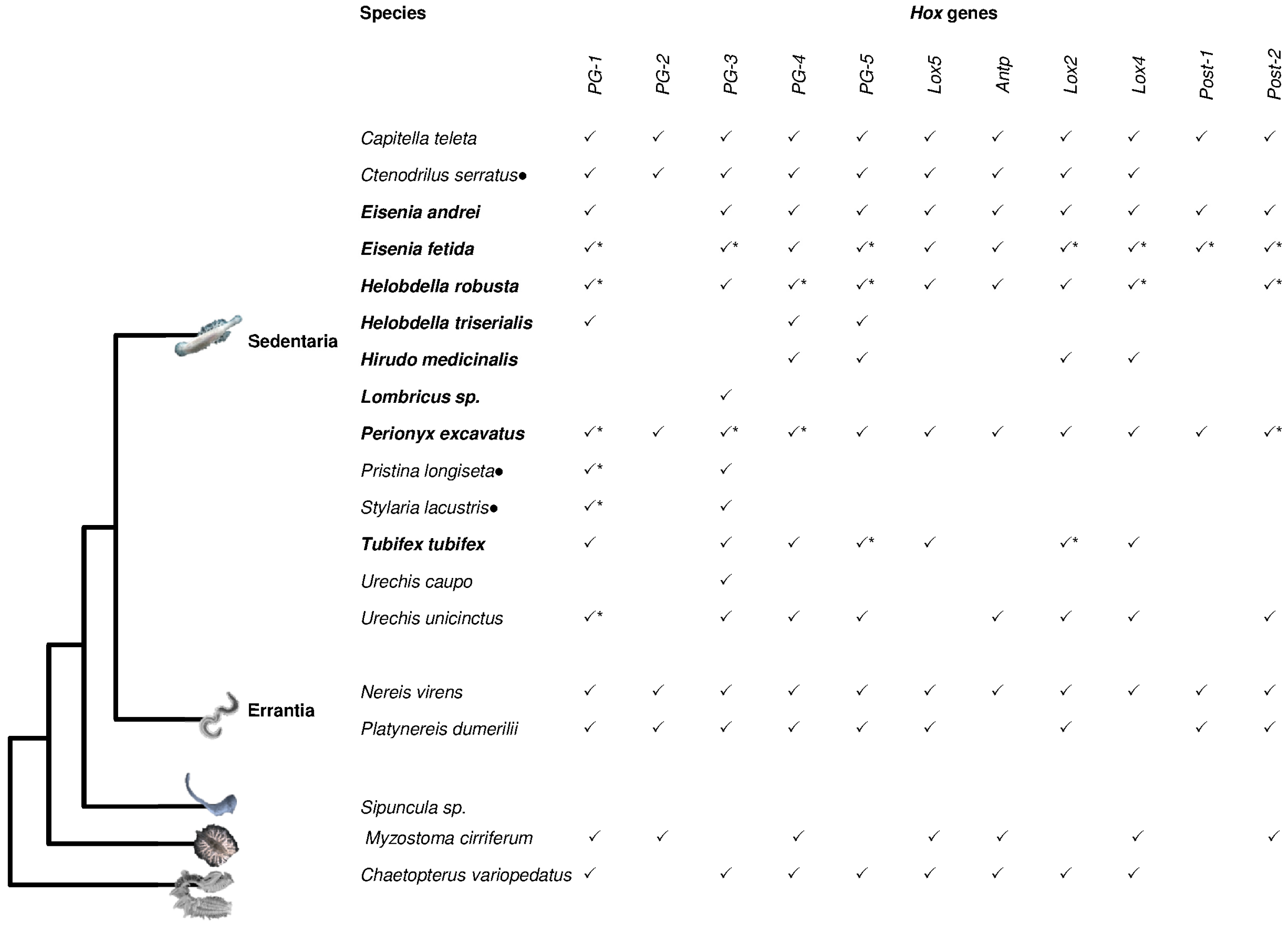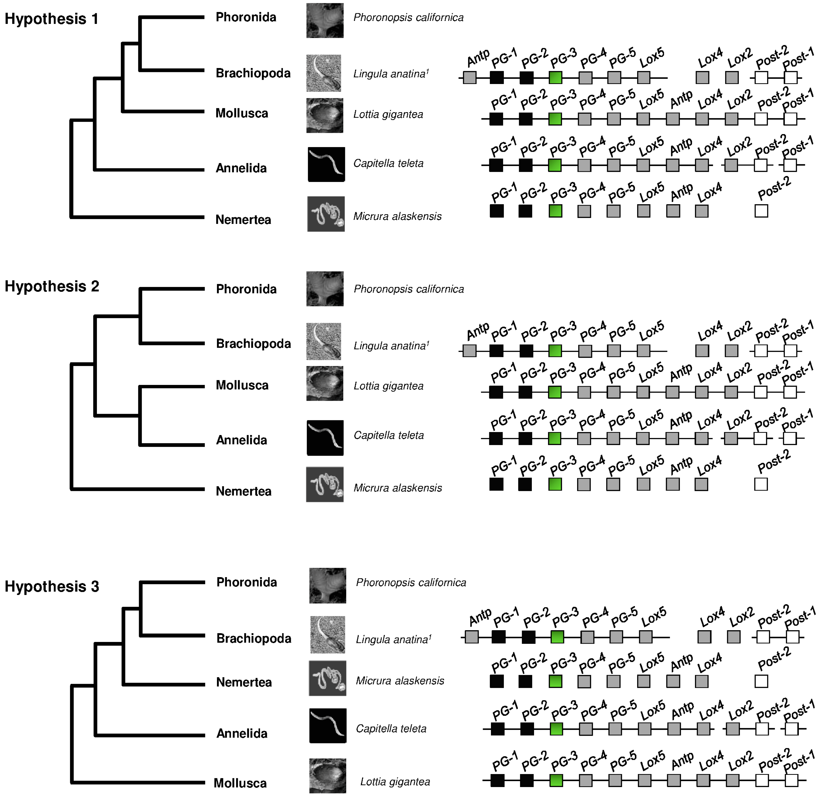 | Phylum | Species | PG-1 | PG-2 | PG-3 | PG-4 | PG-5 | Lox5 | Antp | Lox2 | Lox4 | Post-1 | Post-2 | References |