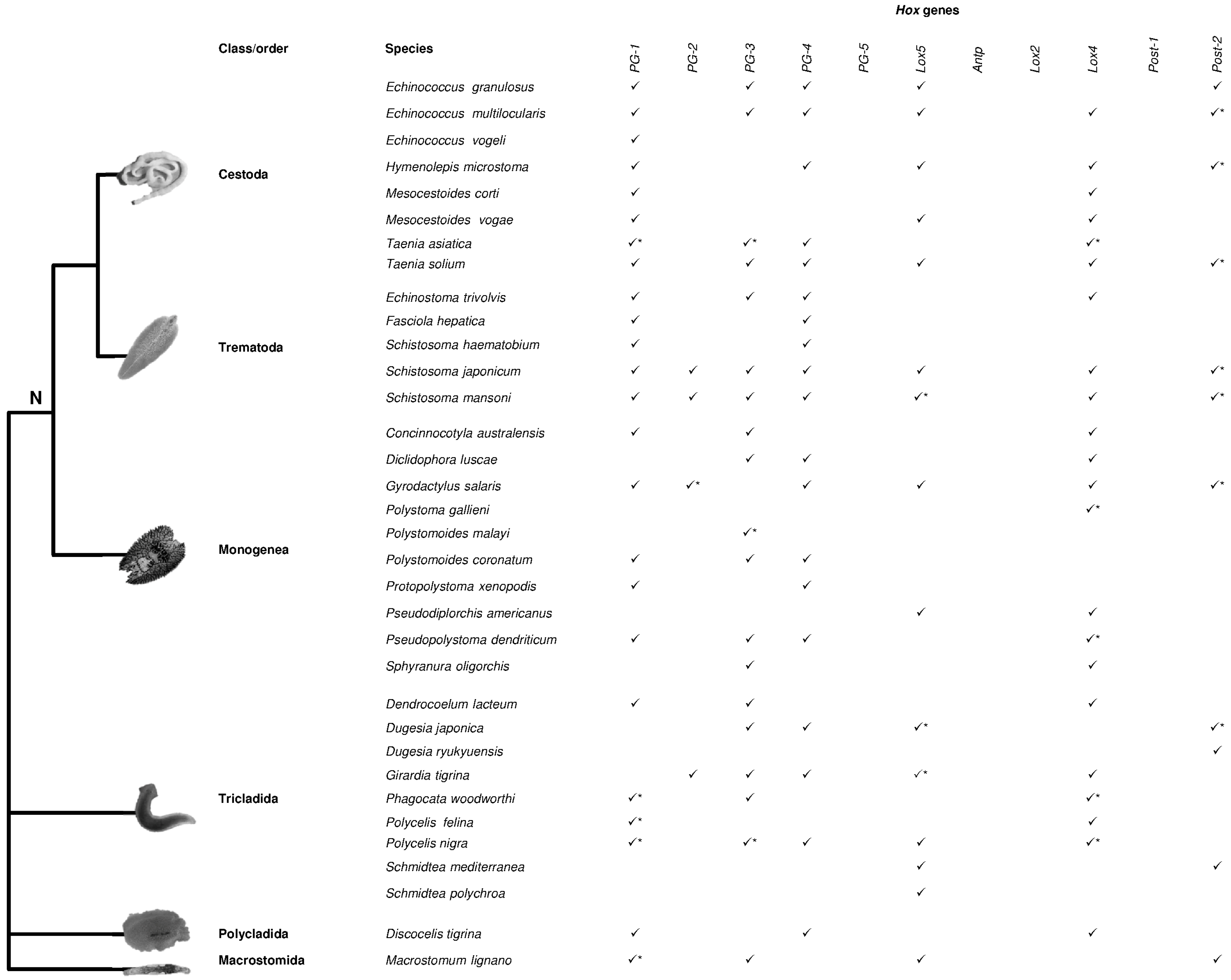 - Koziol, U.; Lalanne, A.I.; Castillo, E. Hox genes in the parasitic Platyhelminthes Mesocestoides corti, Echinococcus multilocularis, and Schistosoma mansoni: Evidence for a reduced Hox complement. Biochem. Genet. 2009, 47, 100–116. [Google Scholar] [CrossRef] [PubMed]